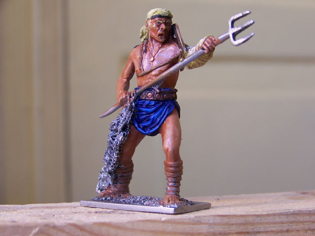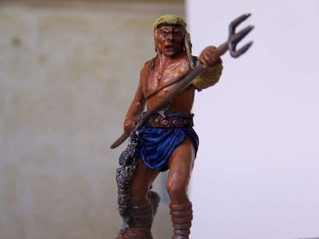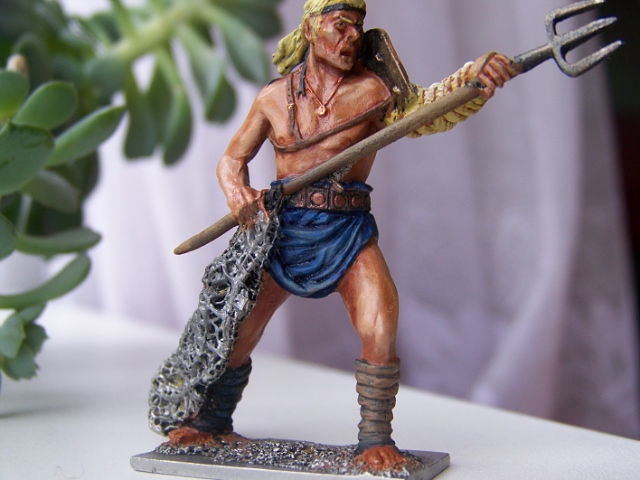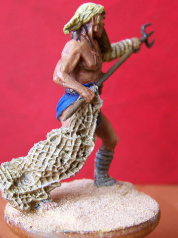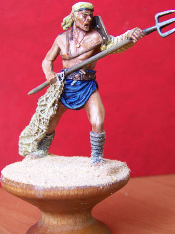 Прошелся лессировкой по "юбке" гладиатора (прошу извинить, правильного названия не знаю), кажись стала какой-то грязной. Добавил высветлений по коже. Покрасил трезубец. Начал работу над обмотками на ногах. Жутко смущает сеть - блямба какая-то. Руки чешутся её спилить и сделать настоящую. Вот только боюсь испортить фигурку. У кого-нибудь есть опыт такой конверсии? Подскажите. Хотелось бы выслушать мнения и по всей проделанной работе.