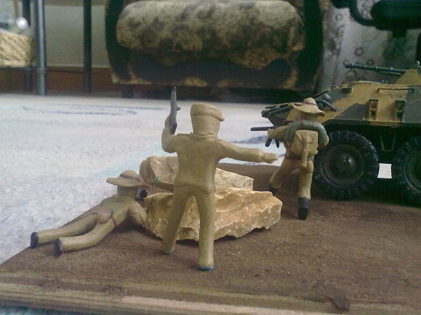 Представляю вашему вниманию мою давнюю работу.Это моя первая диорама, называется "Огонь!"Сюжет довольно прост: Афганистан, колонна русских солдат, засада, "духи" как всегда на скалах. Наши быстро соскачили с брони и открыли ответный огонь. Лепил из пластилина, БТР "звёздовский" был собран по частям( в детстве успел его подраздолбать