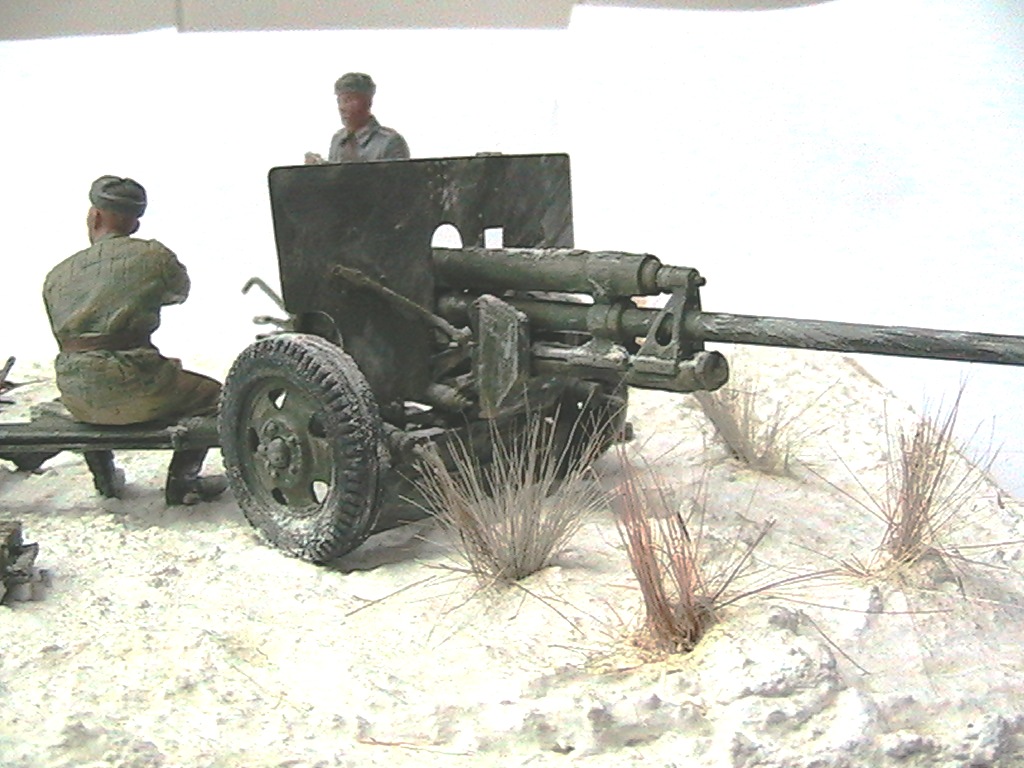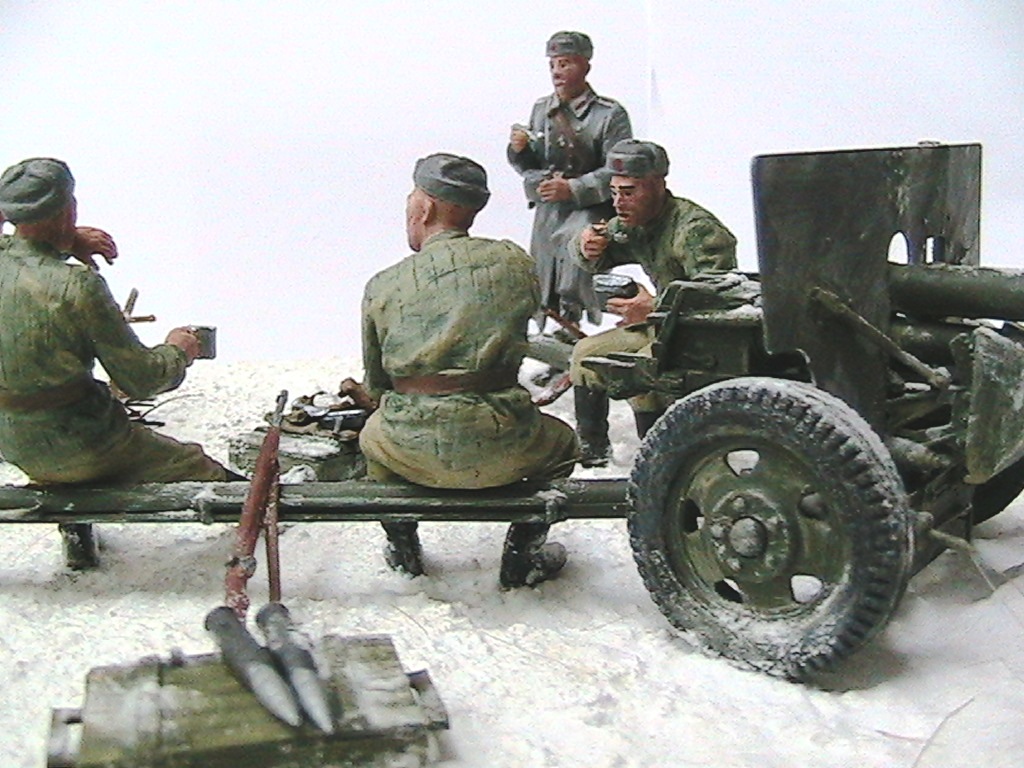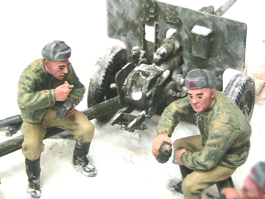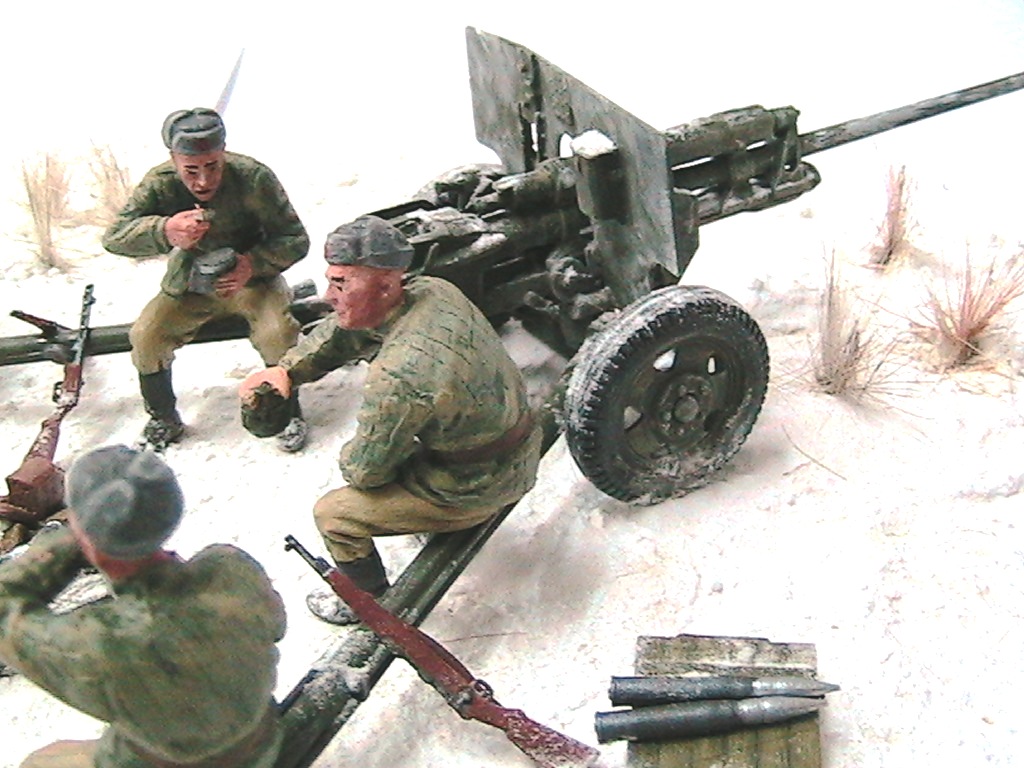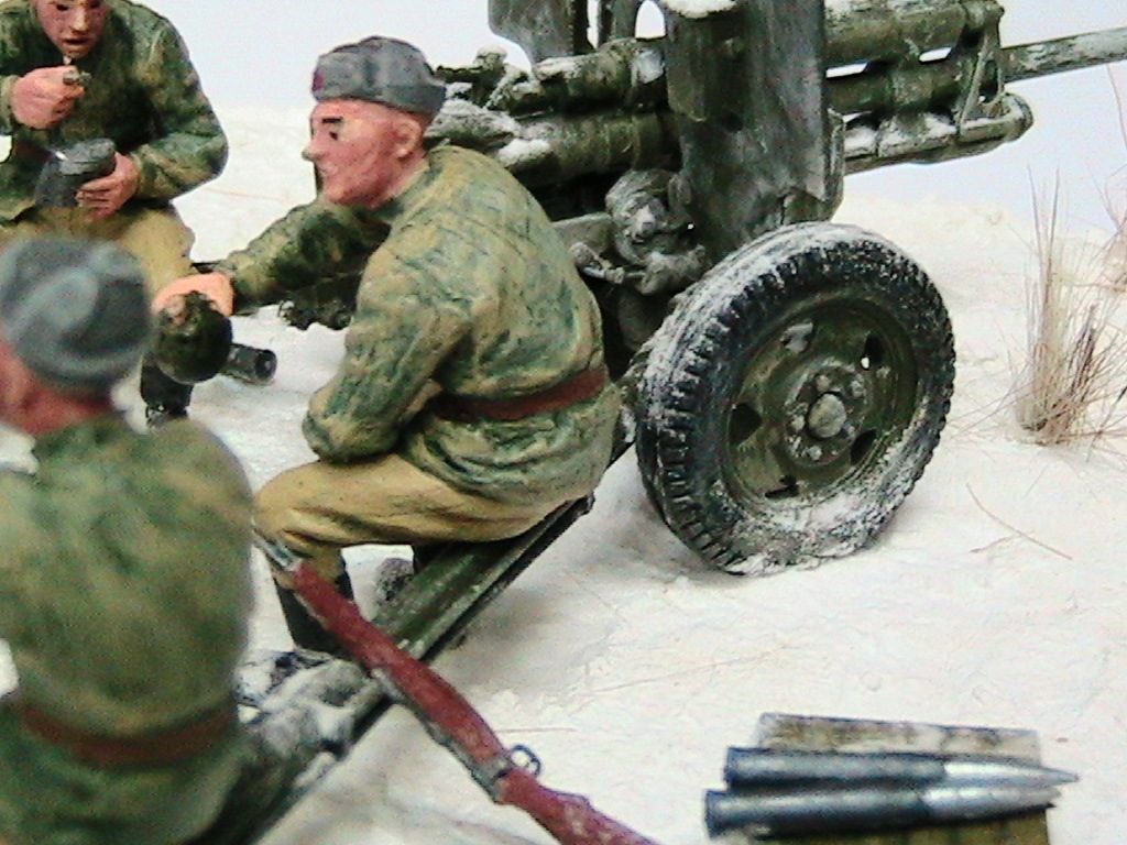 Александр, мне очень понравилось. Одно НО - судя по наличию гильз пушка стреляла, а следов отката орудия на снегу нет. Я полагаю, что ещё не поздно у станин сделать небольшие углубления и кучки из снега и грунта.