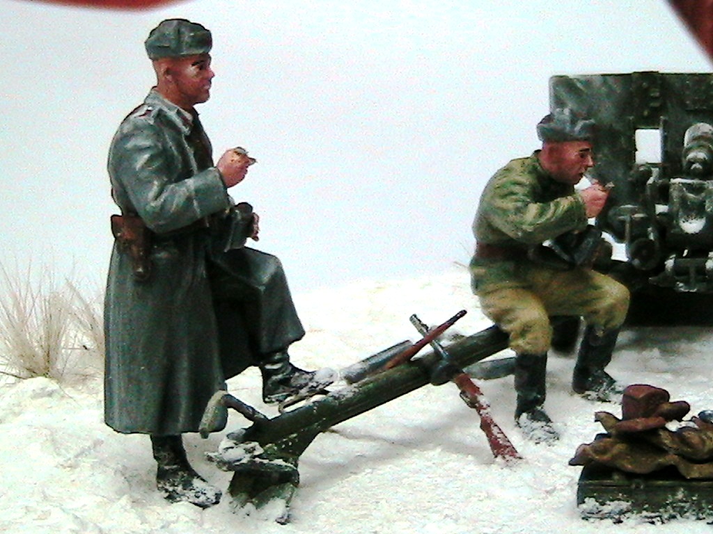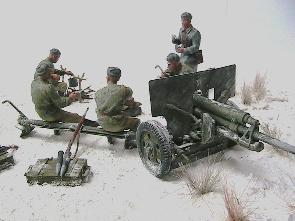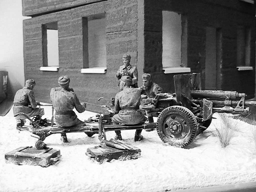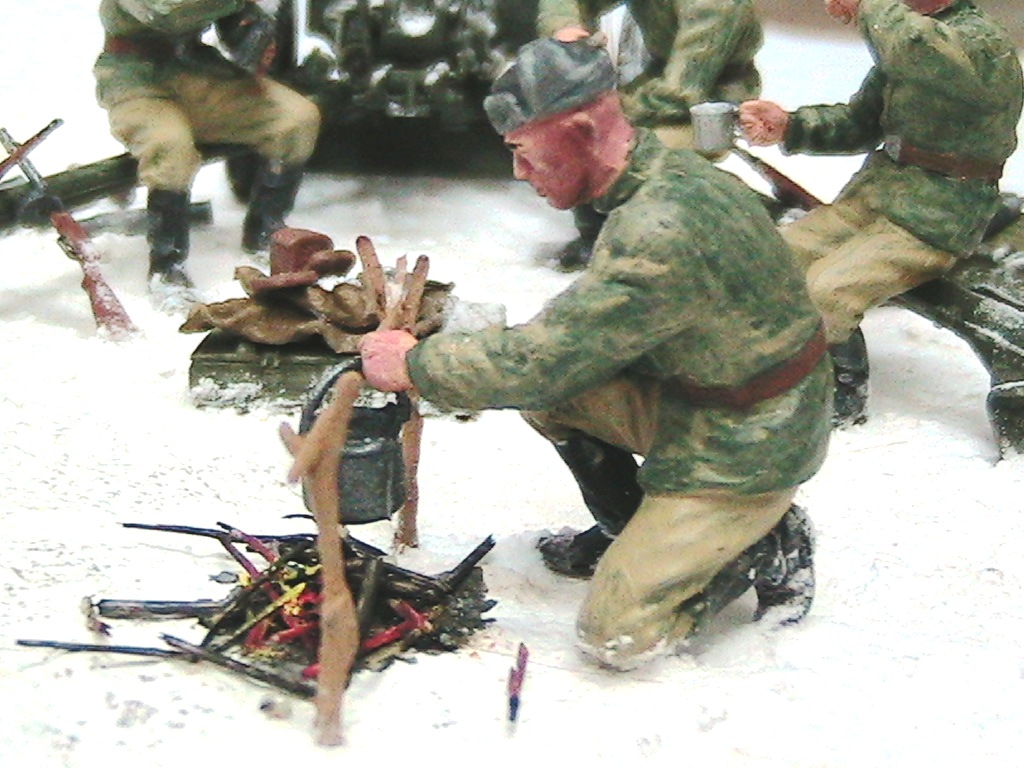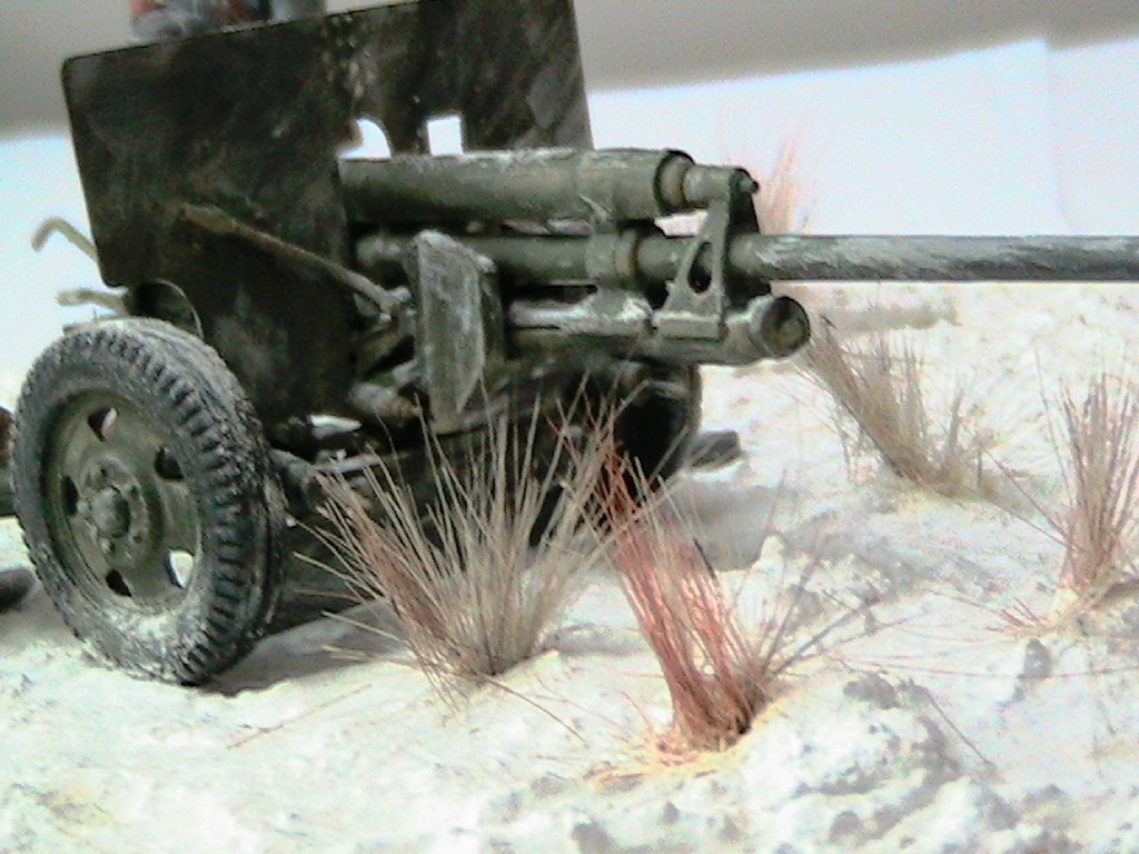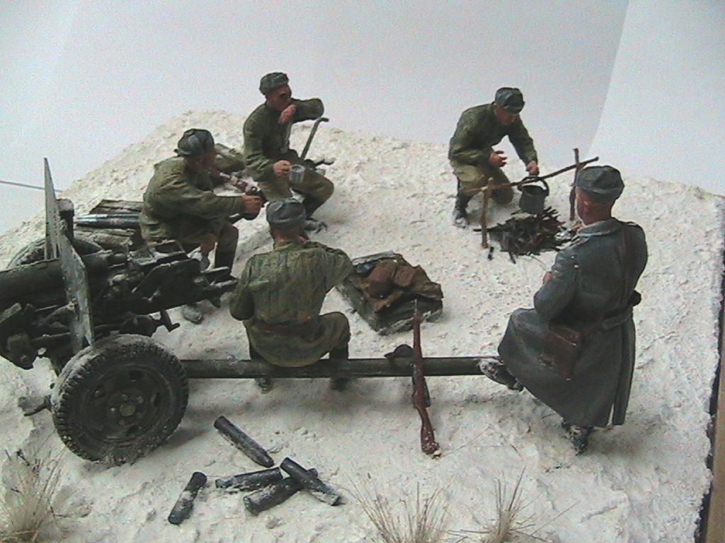 Александр, мне очень понравилось. Одно НО - судя по наличию гильз пушка стреляла, а следов отката орудия на снегу нет. Я полагаю, что ещё не поздно у станин сделать небольшие углубления и кучки из снега и грунта.