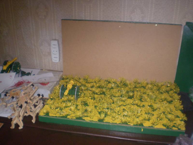 Вот и свершиласть мечта ,,идиота".Сделал наконец то диараму. На всё ушло 3 месяца. Размеры джиарамы 70 см на 40 см.Высота фигурок 13 см. Состав: 3 орудия, 18 артилеристов, 1 офицер(поручик) Материал: фанера, бумага, нитки. Вот и всё.