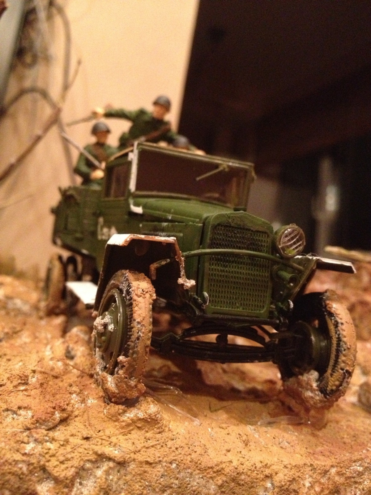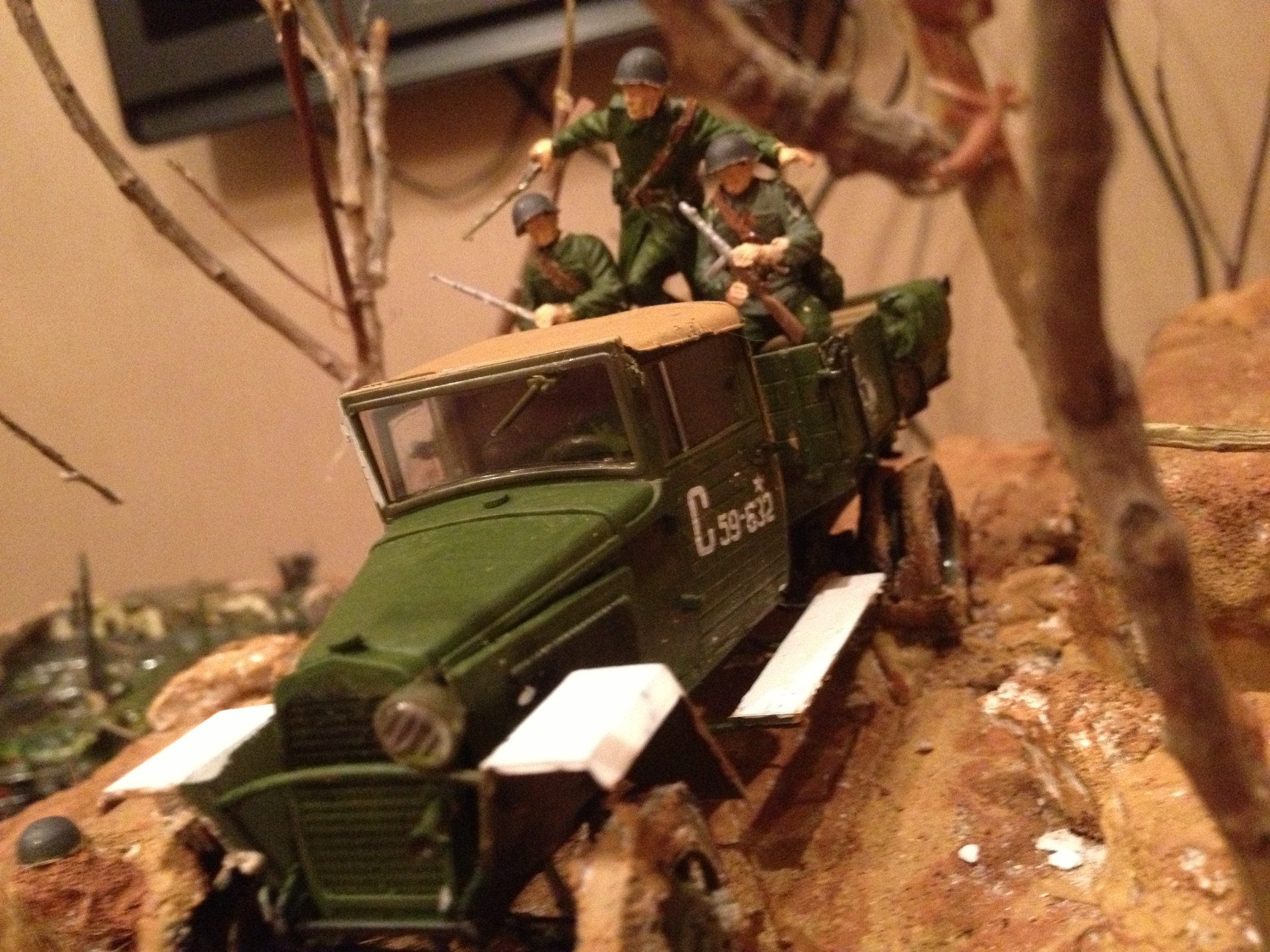 Масштаб 1:35,модель грузовика ГАЗ-ММ, подставка диорамы из ДСП, основание из пенопласта, вода из эпоксидной смолы.