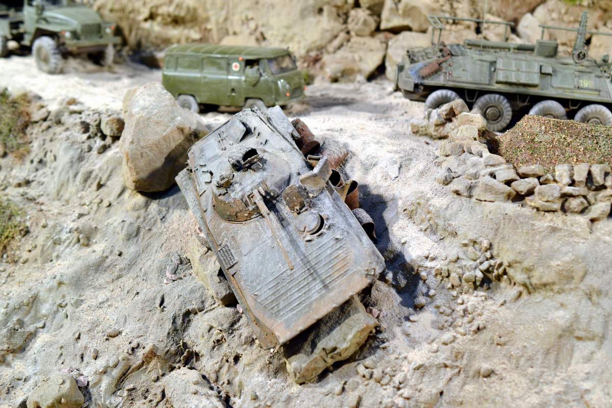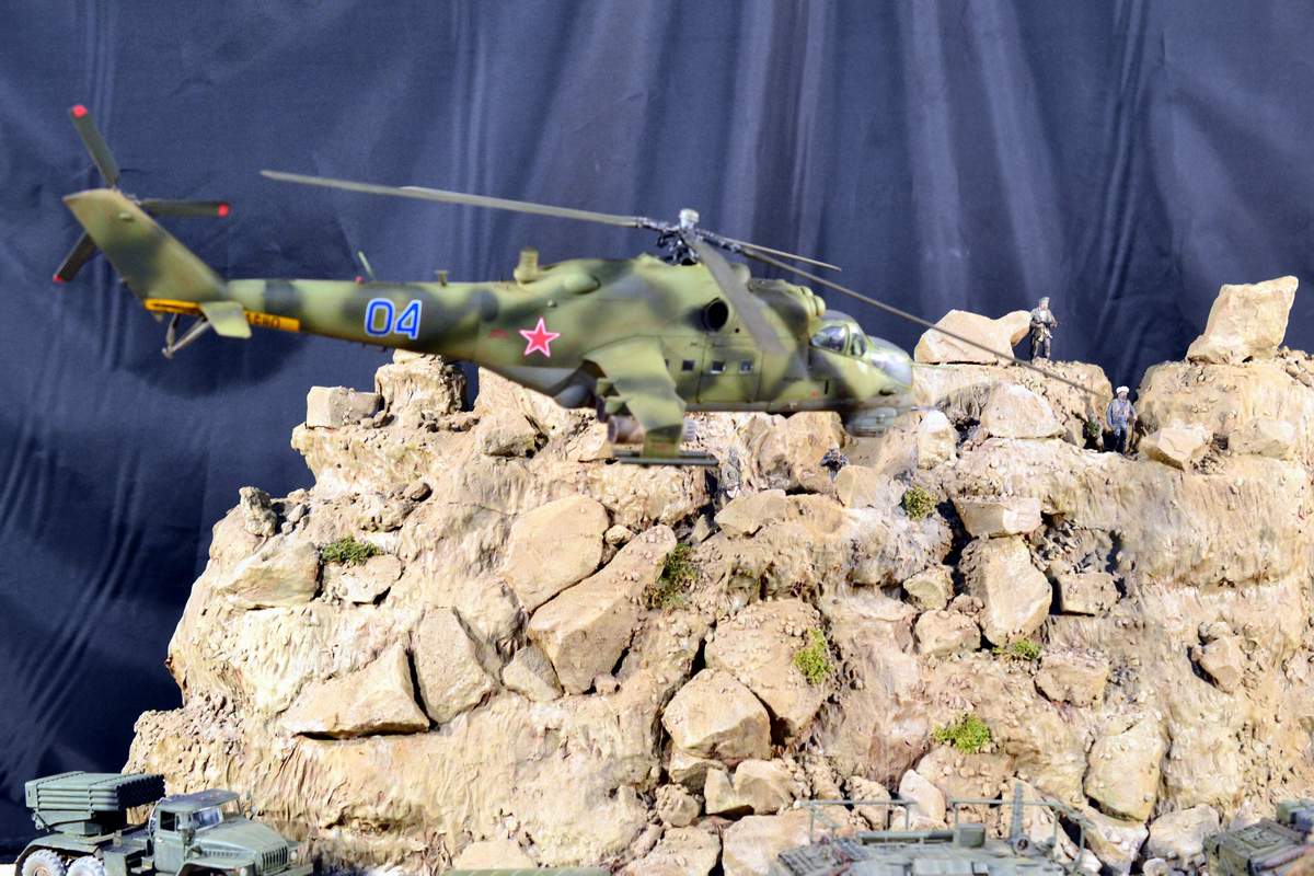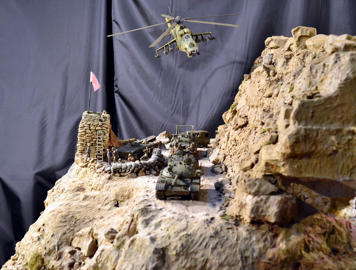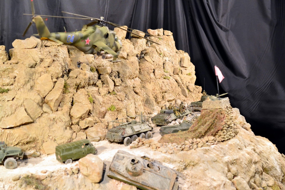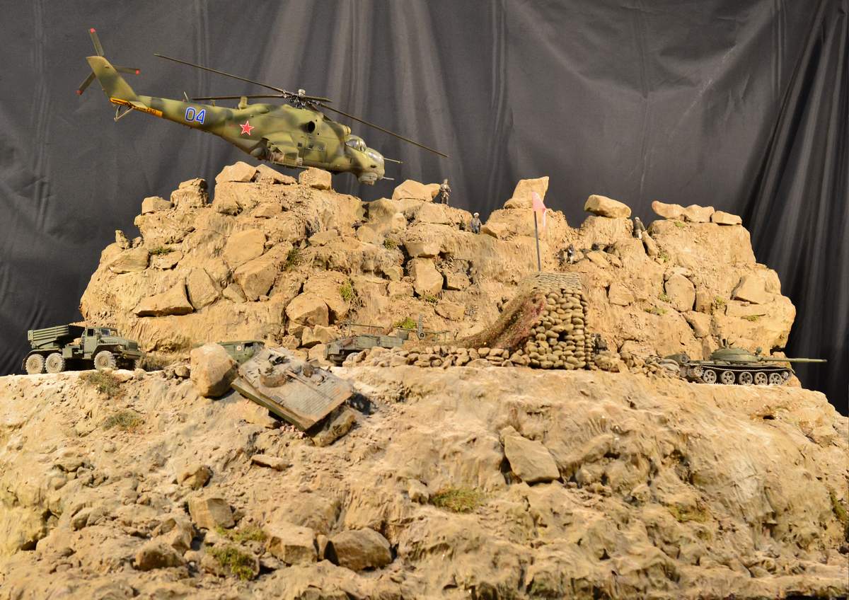 Масштаб 1/35. Практически все модели TRUMPETER, «буханка» - minimanfactory, БМД – СКИФ, БТР-70 – ЗВЕЗДА. Десант и моджахеды masterclub, ANT miniarures, СМК, 5,45. Всё, включая горный массив, покрашено красками TAMIYA. Тонировки использовал MIG и самодельные. Горный массив изготовлен из монтажной пены, обклеенный бумагой на ПВА, плюс добавлены натуральные камни самой разной величины и фактуры. Цвет афганских гор, насколько смог достать из памяти, красно-беж-серо-коричневый (вот такое мудрёное слово). Собственно такие тонировки и использовал при создании макета. Вертолёт закреплён на подставке, сделанной из трёх металлических прутков и покрашенных в чёрный цвет. Самое трудное, как ни странно, было сделать вертолёт. Ни поставить, в одной руке запылишься держать, а всё так хрупко. Сгоревшая БМП сделана из раритетной модели ЗВЕЗДА 1999 года выпуска. Пластик просто супер, аж звенит, хрупкость просто необыкновенная. Фотографий очень много, поэтому буду выкладывать постепенно, начиная с общего плана.