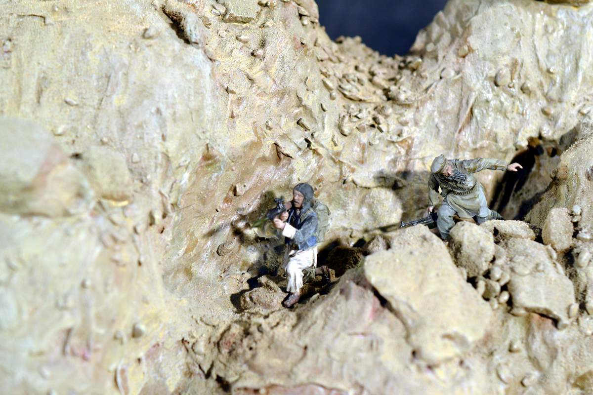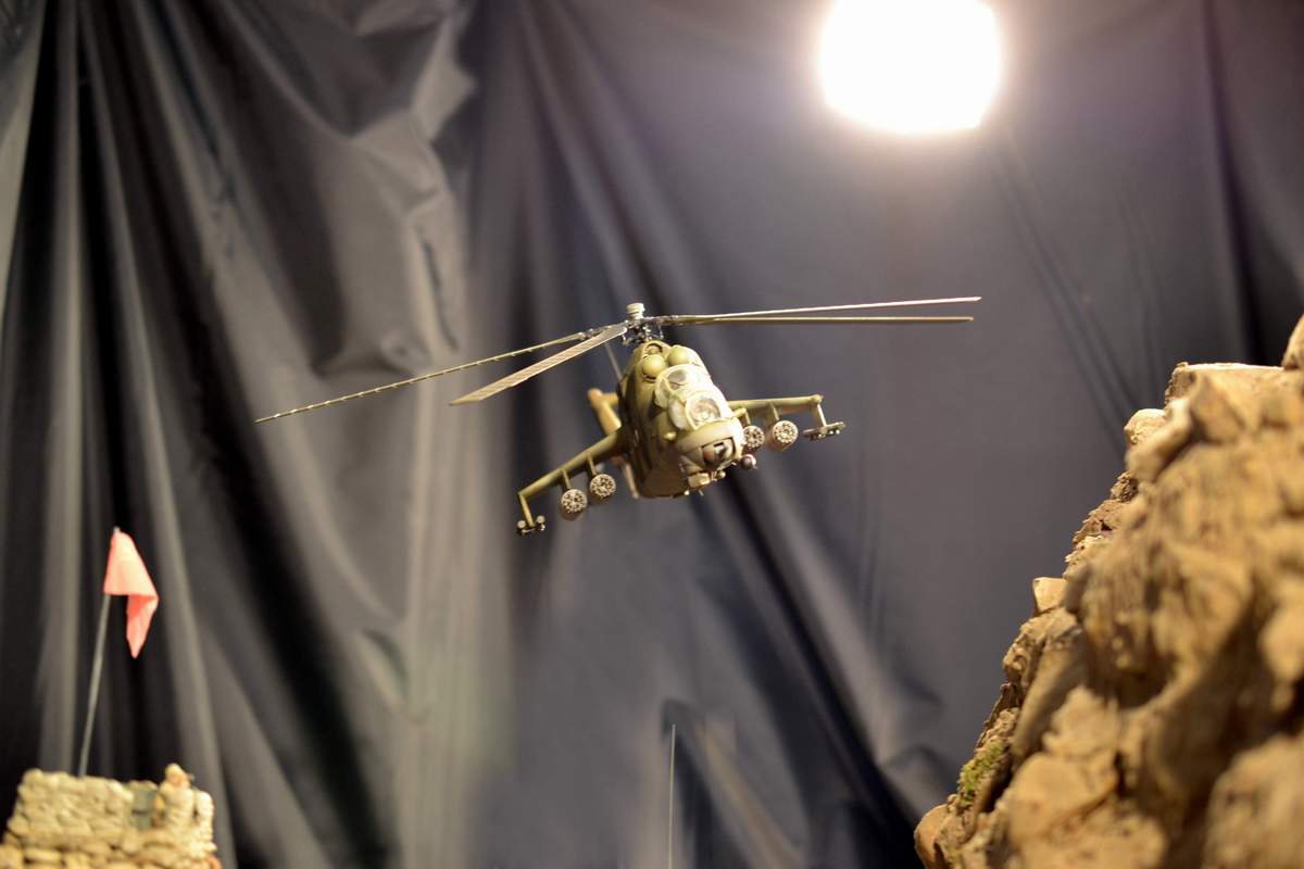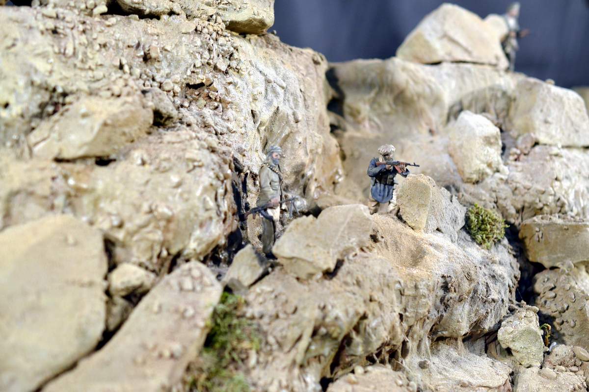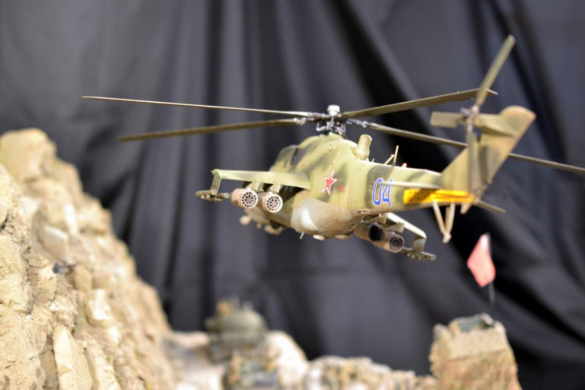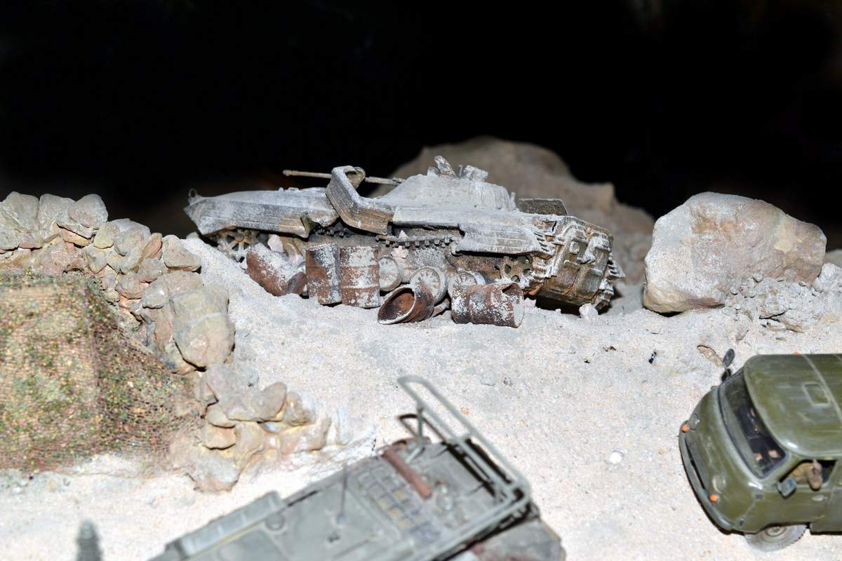 Масштаб 1/35. Практически все модели TRUMPETER, «буханка» - minimanfactory, БМД – СКИФ, БТР-70 – ЗВЕЗДА. Десант и моджахеды masterclub, ANT miniarures, СМК, 5,45. Всё, включая горный массив, покрашено красками TAMIYA. Тонировки использовал MIG и самодельные. Горный массив изготовлен из монтажной пены, обклеенный бумагой на ПВА, плюс добавлены натуральные камни самой разной величины и фактуры. Цвет афганских гор, насколько смог достать из памяти, красно-беж-серо-коричневый (вот такое мудрёное слово). Собственно такие тонировки и использовал при создании макета. Вертолёт закреплён на подставке, сделанной из трёх металлических прутков и покрашенных в чёрный цвет. Самое трудное, как ни странно, было сделать вертолёт. Ни поставить, в одной руке запылишься держать, а всё так хрупко. Сгоревшая БМП сделана из раритетной модели ЗВЕЗДА 1999 года выпуска. Пластик просто супер, аж звенит, хрупкость просто необыкновенная. Фотографий очень много, поэтому буду выкладывать постепенно, начиная с общего плана.