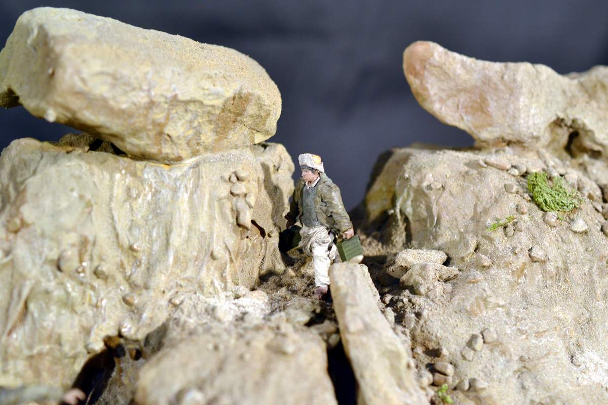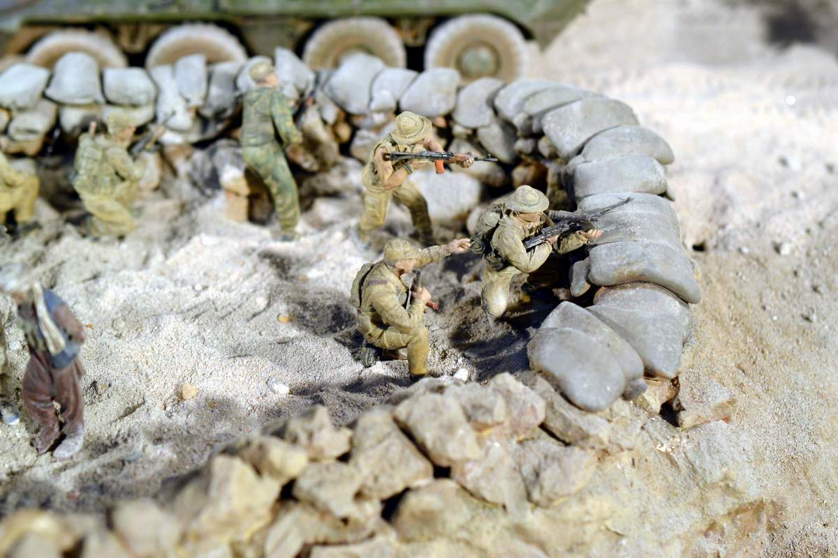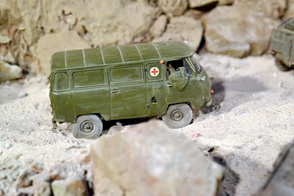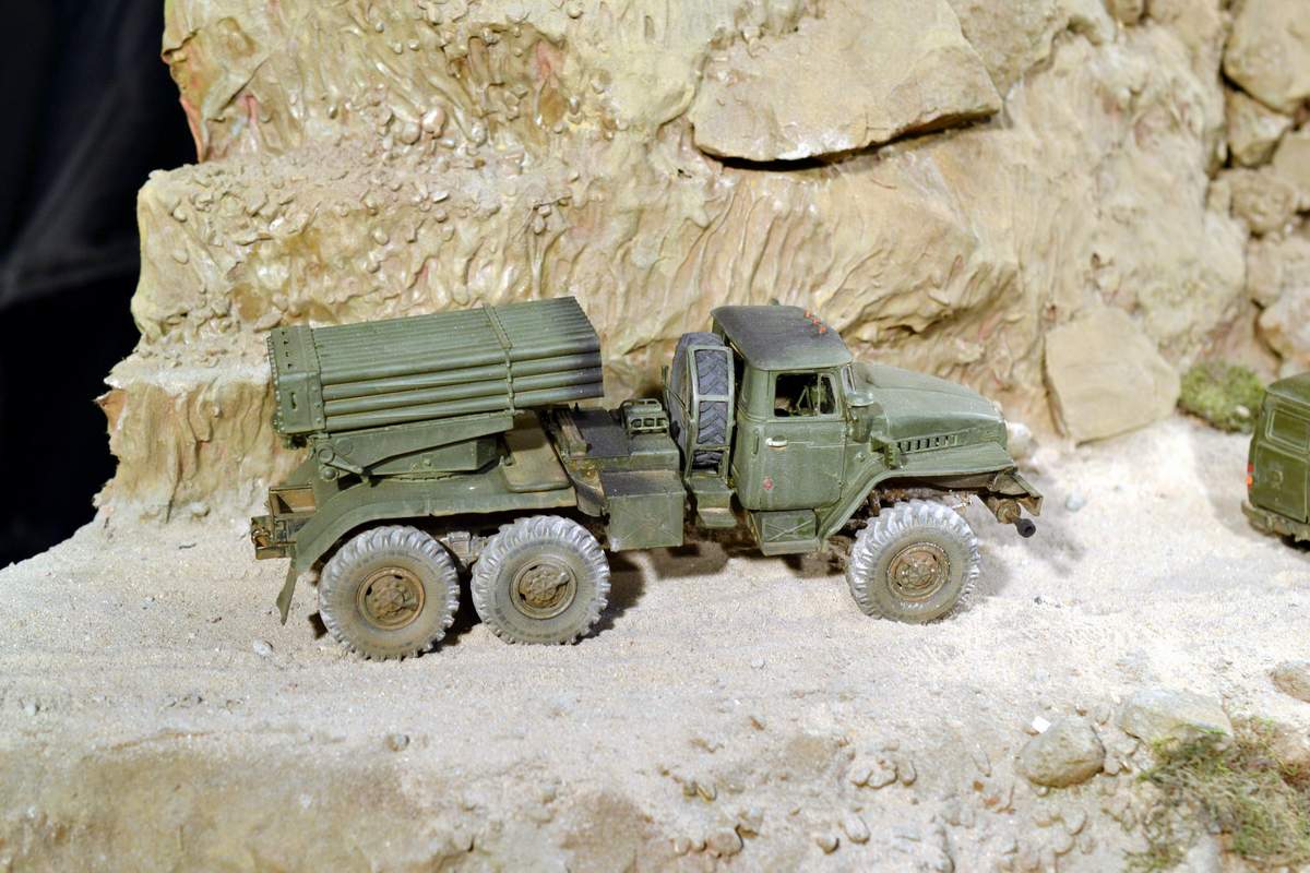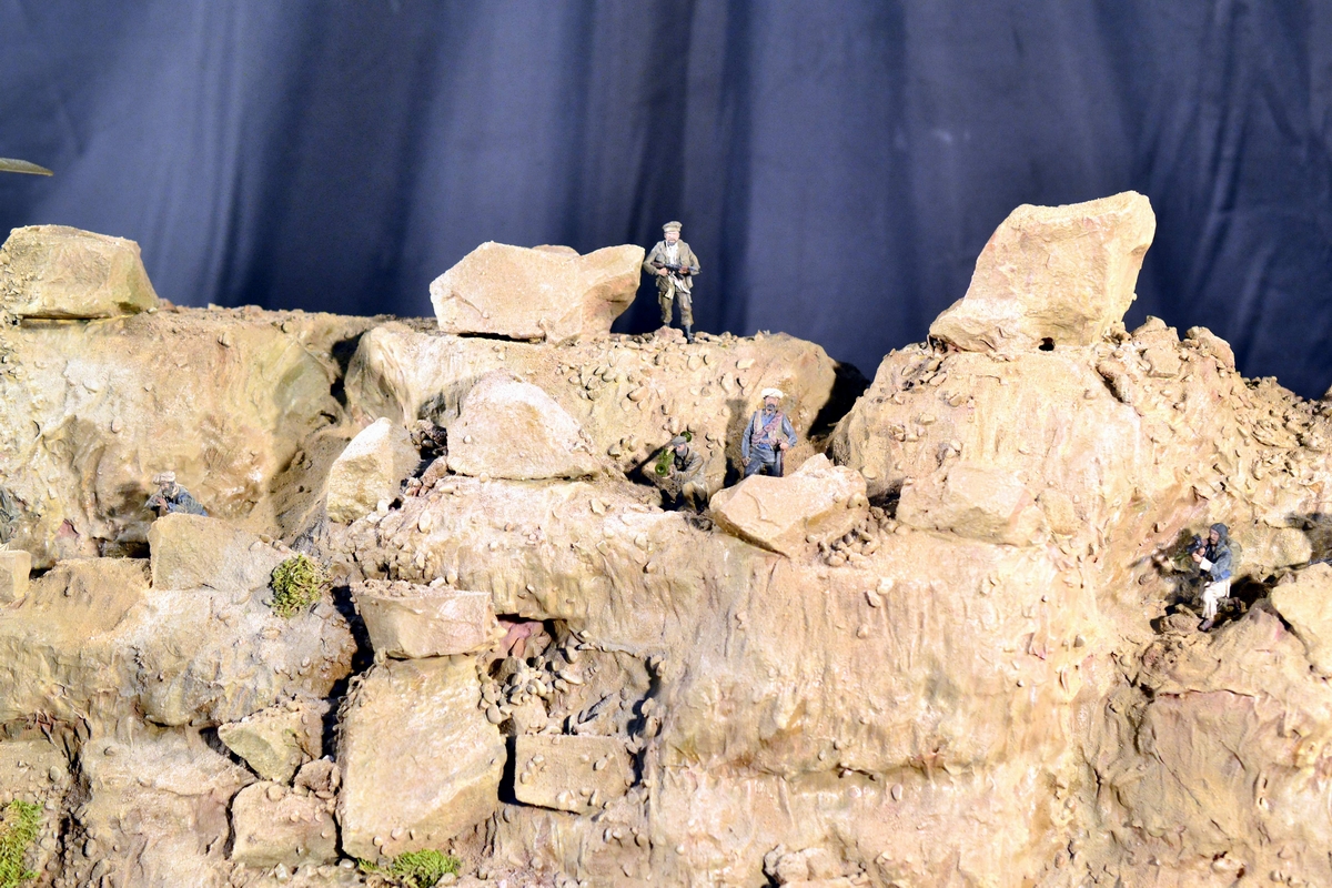 Масштаб 1/35. Практически все модели TRUMPETER, «буханка» - minimanfactory, БМД – СКИФ, БТР-70 – ЗВЕЗДА. Десант и моджахеды masterclub, ANT miniarures, СМК, 5,45. Всё, включая горный массив, покрашено красками TAMIYA. Тонировки использовал MIG и самодельные. Горный массив изготовлен из монтажной пены, обклеенный бумагой на ПВА, плюс добавлены натуральные камни самой разной величины и фактуры. Цвет афганских гор, насколько смог достать из памяти, красно-беж-серо-коричневый (вот такое мудрёное слово). Собственно такие тонировки и использовал при создании макета. Вертолёт закреплён на подставке, сделанной из трёх металлических прутков и покрашенных в чёрный цвет. Самое трудное, как ни странно, было сделать вертолёт. Ни поставить, в одной руке запылишься держать, а всё так хрупко. Сгоревшая БМП сделана из раритетной модели ЗВЕЗДА 1999 года выпуска. Пластик просто супер, аж звенит, хрупкость просто необыкновенная. Фотографий очень много, поэтому буду выкладывать постепенно, начиная с общего плана.