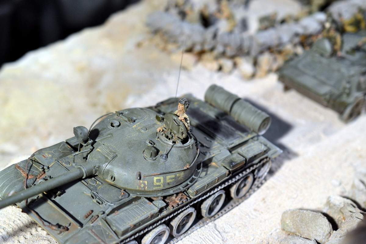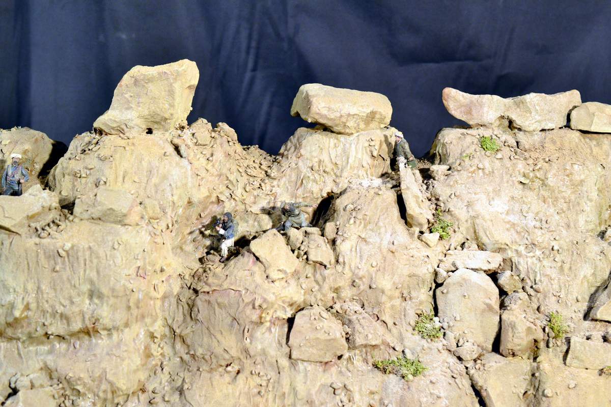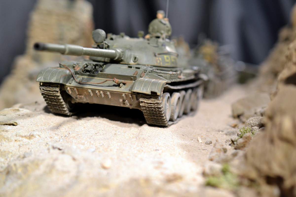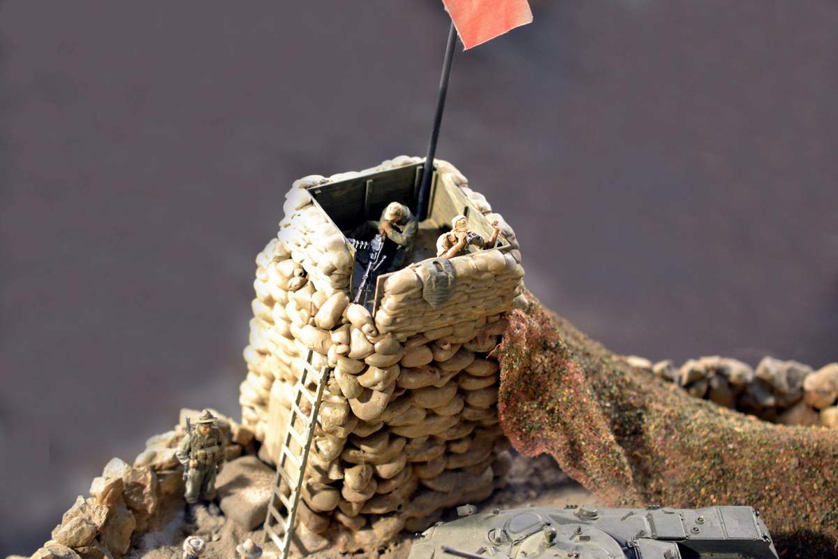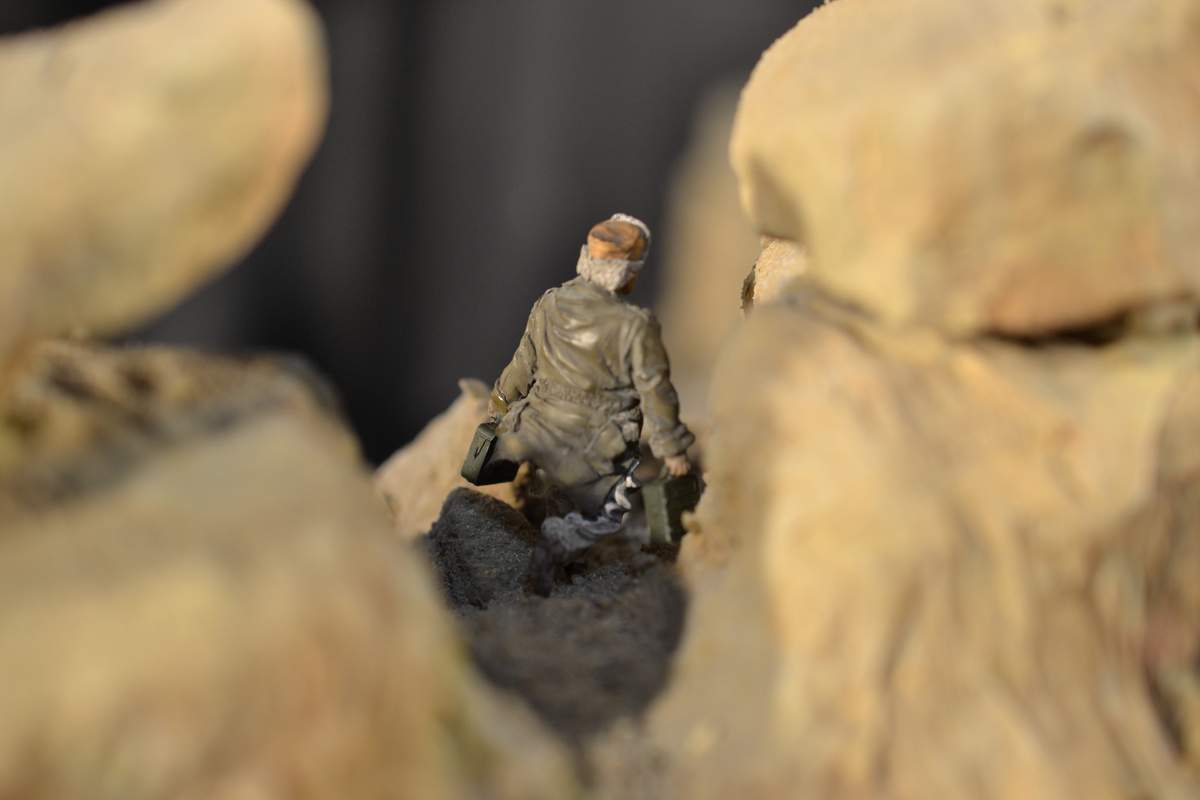 Масштаб 1/35. Практически все модели TRUMPETER, «буханка» - minimanfactory, БМД – СКИФ, БТР-70 – ЗВЕЗДА. Десант и моджахеды masterclub, ANT miniarures, СМК, 5,45. Всё, включая горный массив, покрашено красками TAMIYA. Тонировки использовал MIG и самодельные. Горный массив изготовлен из монтажной пены, обклеенный бумагой на ПВА, плюс добавлены натуральные камни самой разной величины и фактуры. Цвет афганских гор, насколько смог достать из памяти, красно-беж-серо-коричневый (вот такое мудрёное слово). Собственно такие тонировки и использовал при создании макета. Вертолёт закреплён на подставке, сделанной из трёх металлических прутков и покрашенных в чёрный цвет. Самое трудное, как ни странно, было сделать вертолёт. Ни поставить, в одной руке запылишься держать, а всё так хрупко. Сгоревшая БМП сделана из раритетной модели ЗВЕЗДА 1999 года выпуска. Пластик просто супер, аж звенит, хрупкость просто необыкновенная. Фотографий очень много, поэтому буду выкладывать постепенно, начиная с общего плана.