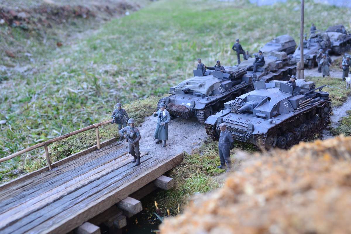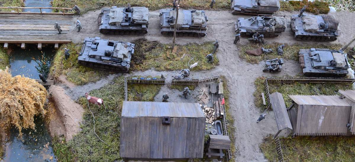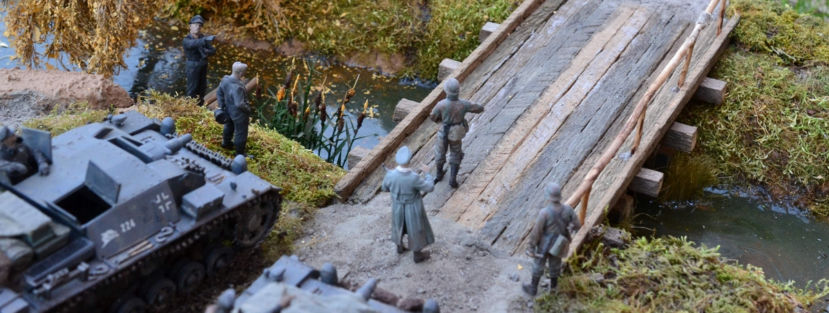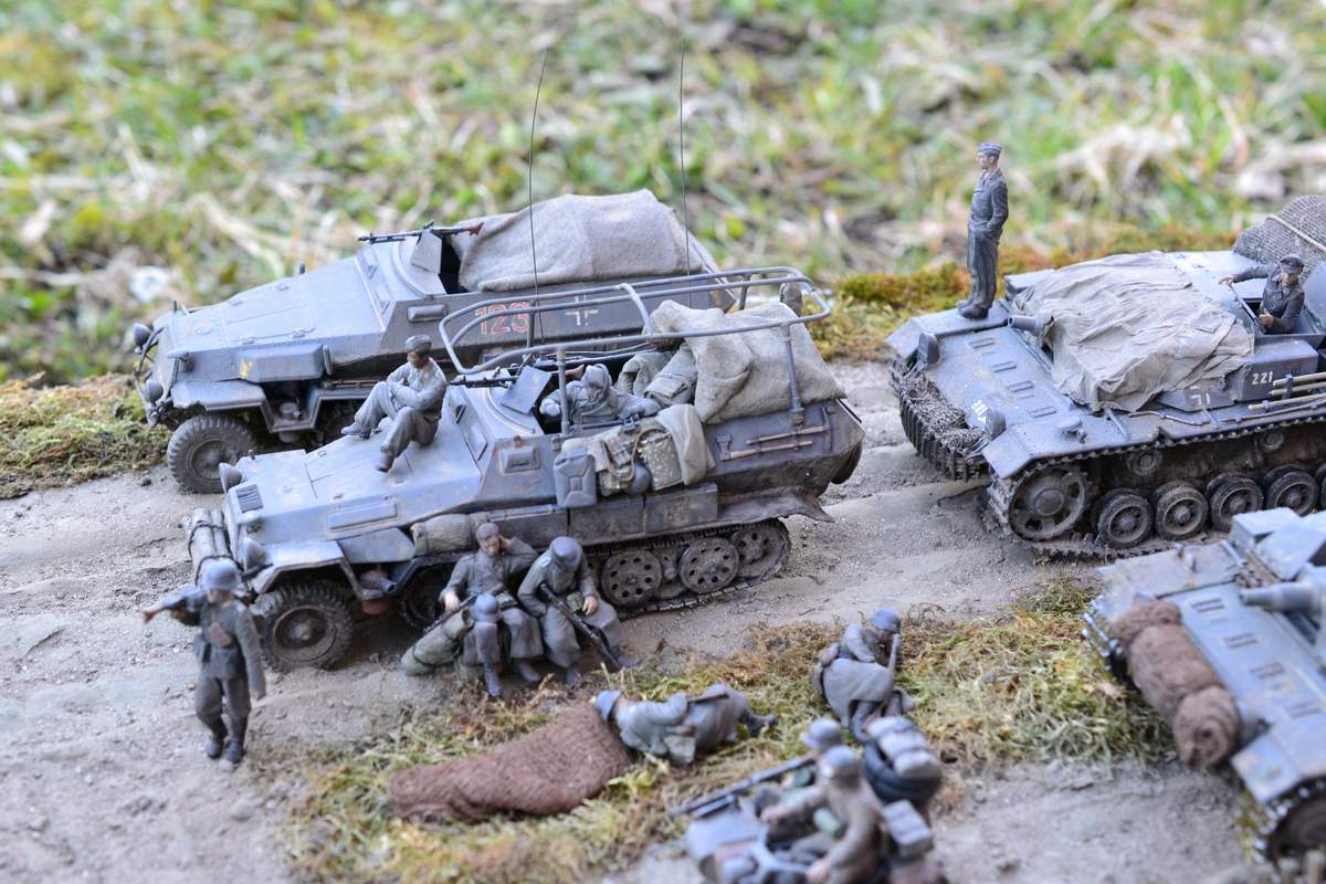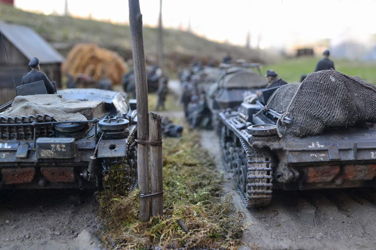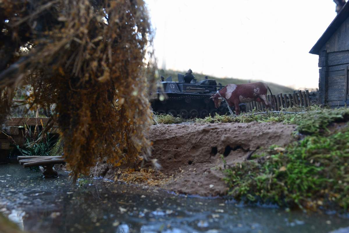 Масштаб 1/35. При построении использовал модели и фигуры Zvezda, Dragon, MB, Tank, Бастион 35, Mini Art . Красил красками TAMIA,тонировки MIG и самодельные на основе масляных красок. Основание диорамы монтажная пена, растительность натуральный мох.