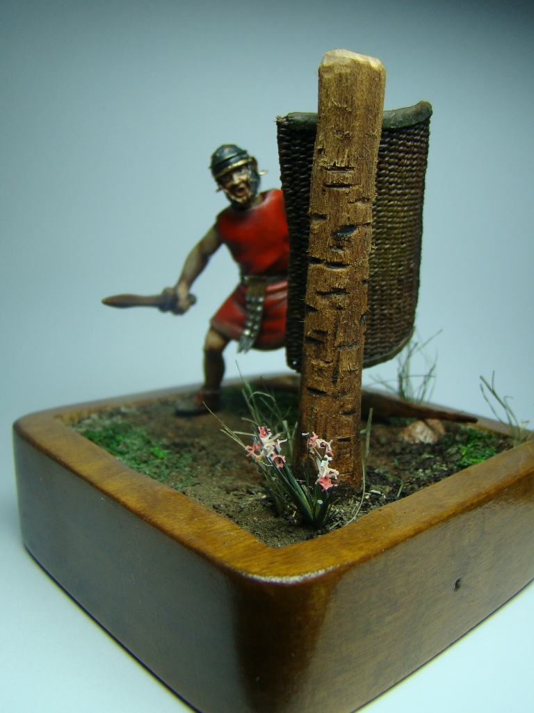 Фигурка 54мм - конверсия римского велита периода республики студии "Ермак сиб", ремень изготовлен из бумаги, учебный скутум сплетен из капроновой нитки, учебный пилум (на земле) сделан из дощечки, основание из куска ольхи, земля - обычная пересеенная-перемолотая земля, трава - мох и сизаль стриженная, столб для отработки ударов корень абрикоса. На историческую достоверность не претендую, все делалось из картинки в журнале. Роспись акрил, масло, жидкая поталь, пигменты MIG. У меня это первая виньетка (клянусь!!