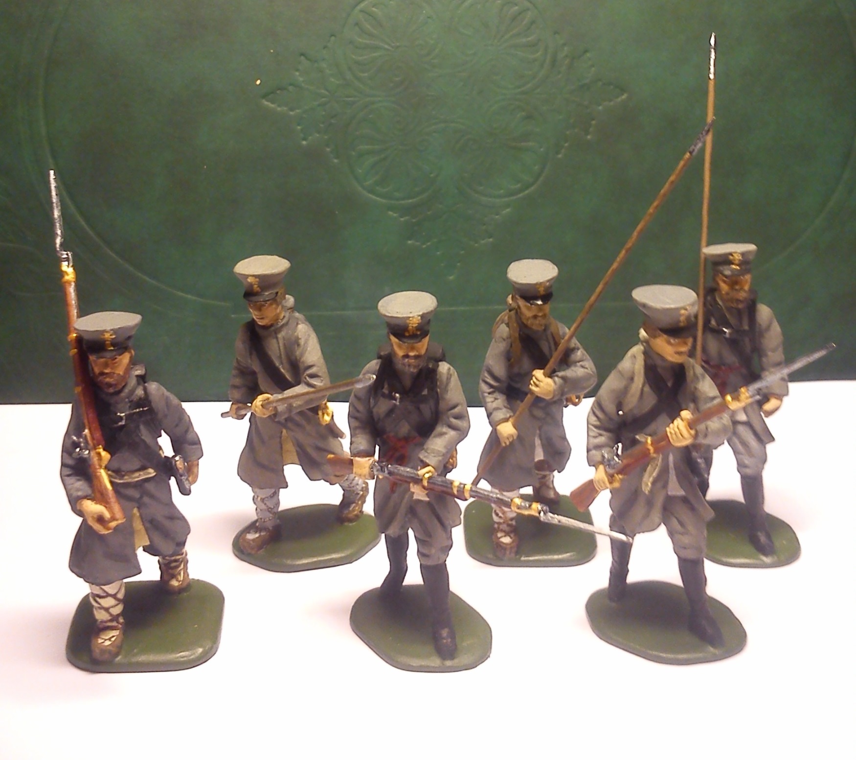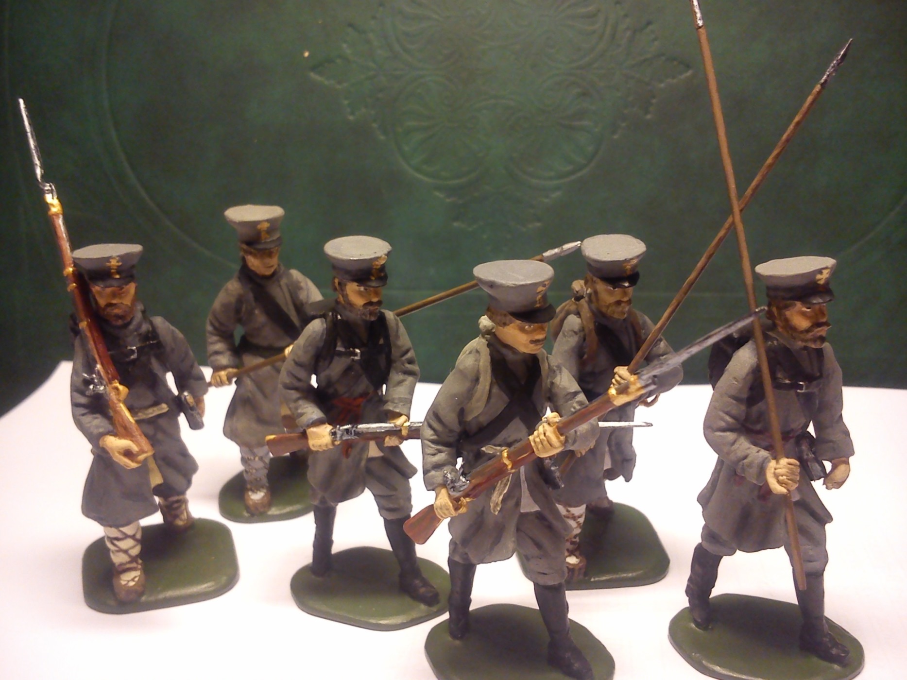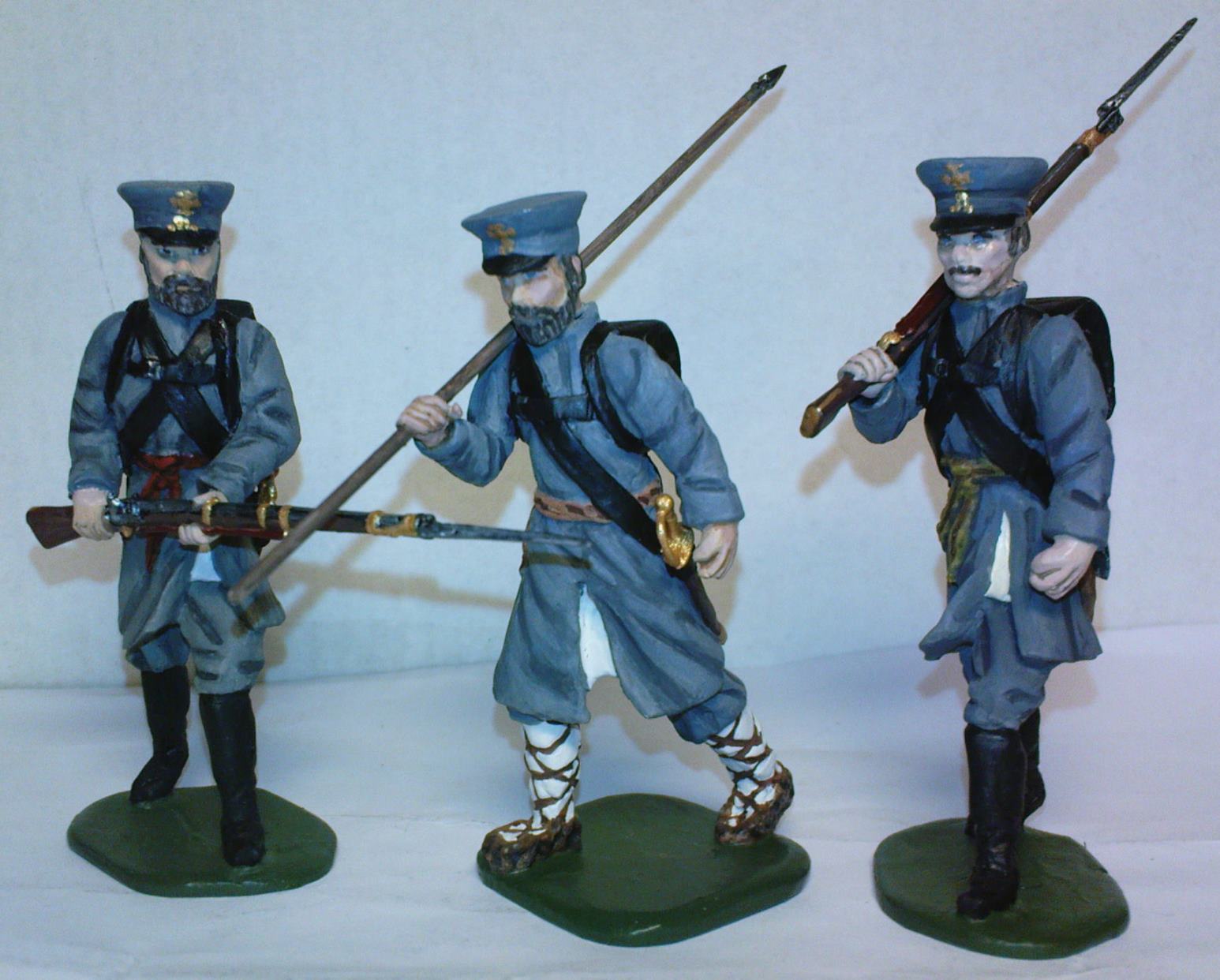 Оловянно-свинцовый сплав. Высота 54 мм (если честно – 57 мм). Мастер-модели лепились из эпоксилина. Ружье и лица сам не лепил, скопировал с купленных фигурок, добавил бороду. Краска - Звезда акрил.