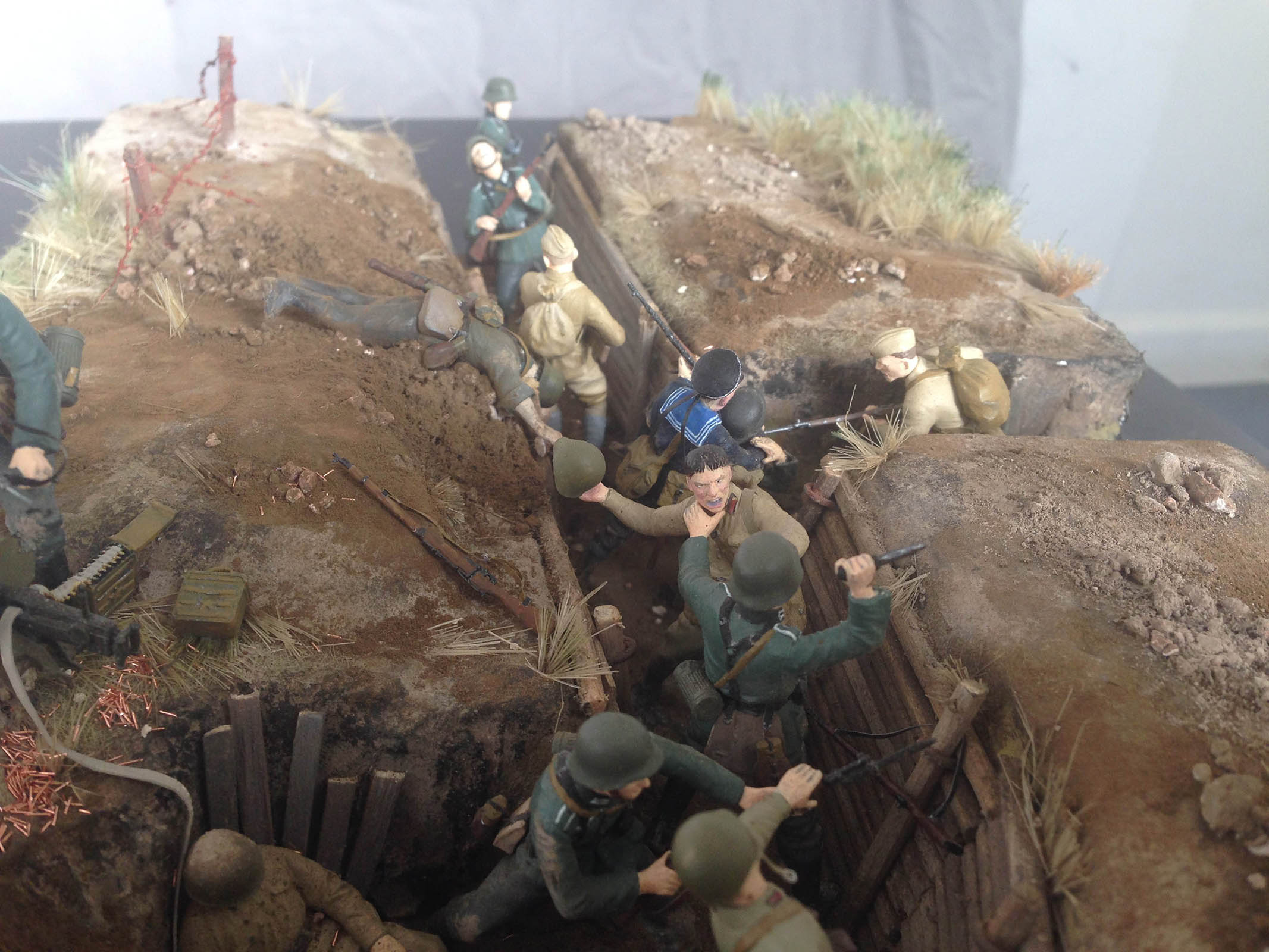 очень понравился ландшафт.Может намного надо было перед окопом змелько побольше набросать,как на той же фотографии,которую показали в сообщении.А почему проволока КРАСНАЯ и как то немного одиноко стоит.я то конечно и так не умею и не разу не пробовал.но кажется,что вот такие ровные пучки немного портят атмосферу.про фигурки уже сказали.