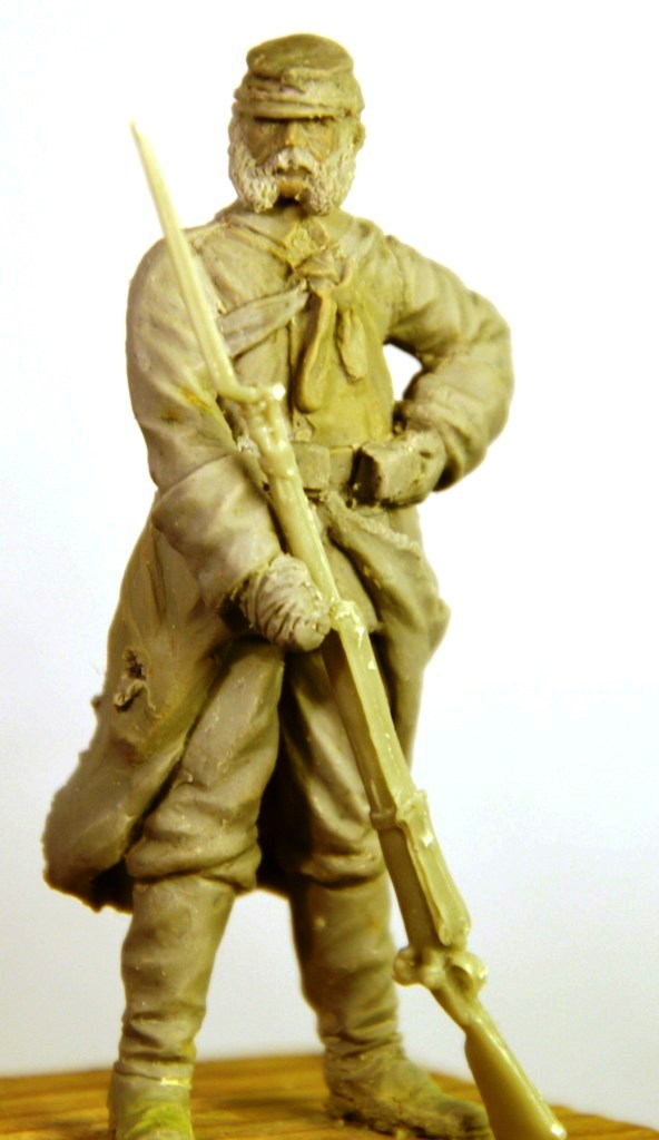 сперва была задумка,что должен быть с сигаретой.Ружьё взял от Chronos Miniatures.Шинель,не знаю как получилось в низу немного потрёпанная.Получился такой воин из боя в тыл,может на перевязку.В низу у каблука забыл снять пластилин,из-за этого вид не очень аккуратный.Теперь осталось продумать подставку