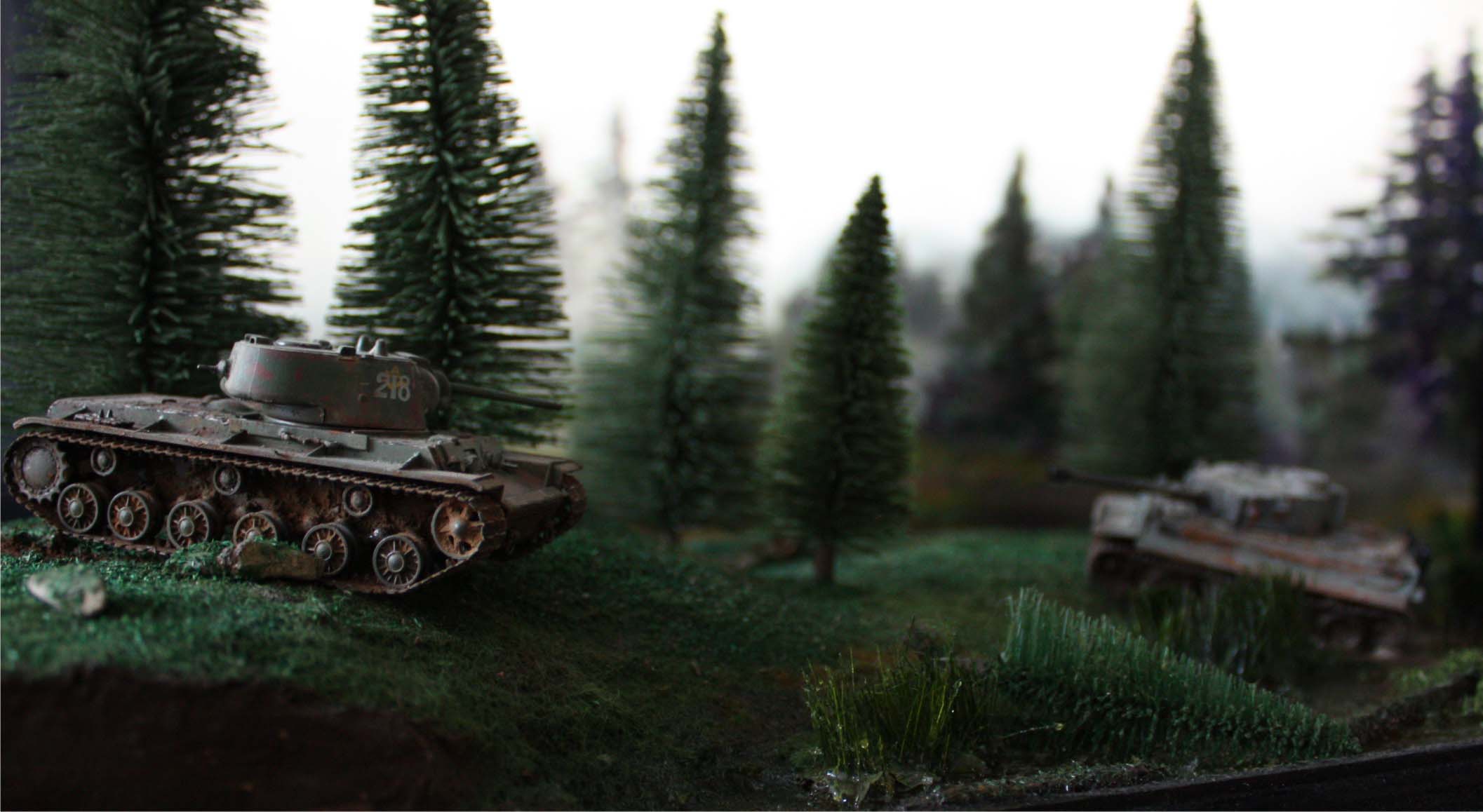 Представляю вашему вниманию мою первую работу. Диорама с говорящим названием "Встретились". Масштаб 1:72. В диораме использовались акриловые краски от "Звезда" и "Tamiya", химия от "Tamiya", смывки "Wilder". Идея для диорамы родилась давно, да все как то руки не доходили. У меня имелся собранный и покрашенный немецкий танк "Тигр-1" и захотелось создать так сказать ему антураж. Танк был окрашен кистями, т.к. компрессора с аэрографом на тот момент не имелось, и о различных приемах в покраске моделей, а тем более химии я на тот момент не слышал. Т.о. я уже окрашенный танк доработал эффектами химии, ржавчины и вообще основательно его "обработал".Так же в диораму вошел советский "КВ-1" окрашенный аэрографом и доработанный химией. Основанием ландшафта диорамы служит строительная пена, поры после застывания которой закрыты банальным папье маше из смеси салфеток и ПВА, сверху покрытием эффекта земли от "Tamiya", затем снова ПВА и различные виды травяного покрова от "Звезда". Болото-эпоксидка и немного силикона для имитации небольших брызг под гусеницами танка. Елочки получились смешные к сожалению, т.к. использовал наборные от "Звезда". Данную ошибку в дальнейшем обязуюсь исправить изготовлением самодельных.Бревно в болоте-поломанная и окрашенная "китайская" палочка для суши. Камыши так же наборные. Камни-галька покрытые мхом со слоем ПВА, на которую нанесен наборный травяной покров. Солдаты фирмы "Звезда".Заранее спасибо за критику, постараюсь внимать каждому замечанию)Приятного просмотра!
