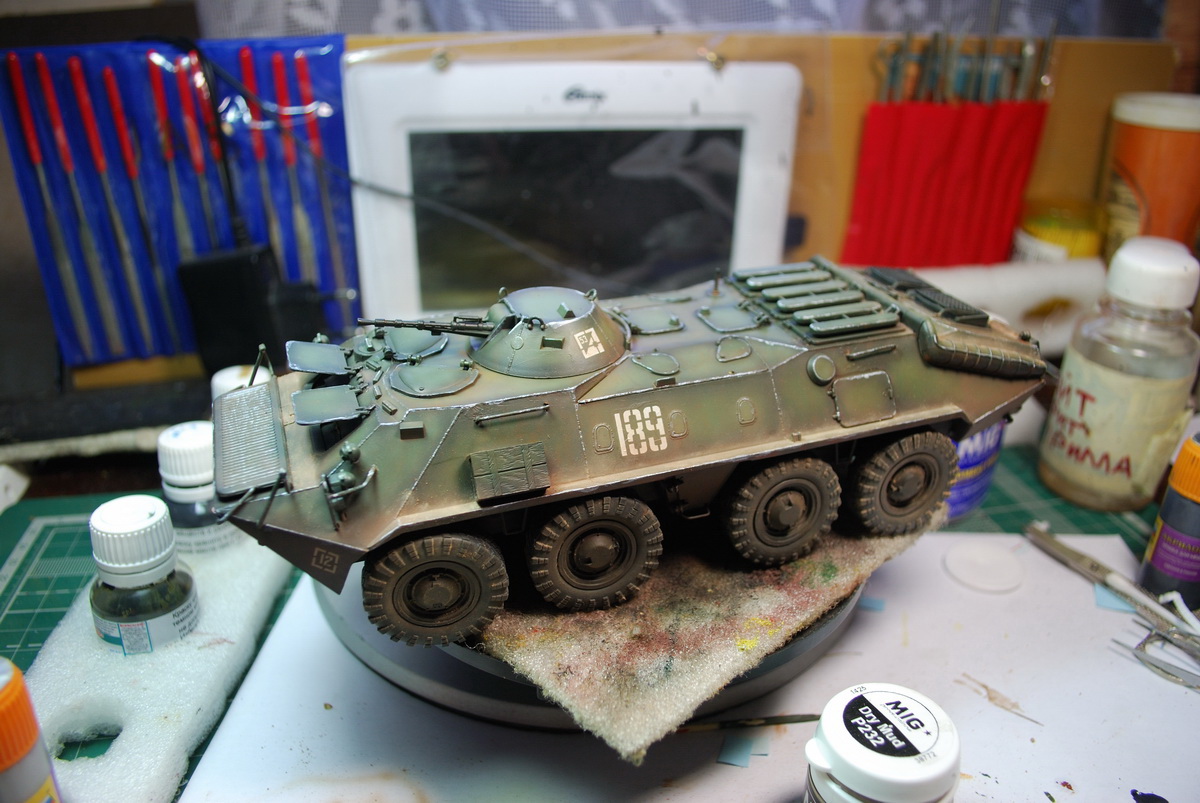Звездовский БТР-70, все вроде прекрасно, только задняя часть корпуса упорно не захотела состыковаться с нижним и верхним корытом. Сначала хотел сделать двухцветный камо, но нет опыта, плюнул и решил сделать монотонную окраску. Покраску делал по ролику Warfare in Scale Cold War Series Episode 1 - Russian BTR-70 1-35 Dragon Models с ютуба, очень понравилось, показалось что это куда быстрее нежели "классическая испанская школа", нет этой кучи слоев - высветлений, здесь только грунтовка, базовый темный слой, одно высветление от центра поверхностей корпусных деталей и люков, матовый лак от Звезды и фильтр Flat Earth XF-52 поверх. Краски Tamiya XF, солдатики полностью темпера. Потертости - алюминий от Звезды, такой пластиковый флакончик, у Звезды вообще лучшие в мире металлики по натуральности. Пигменты - MIG и Мастер пигмент. Добавил латунную сетку 0,6 на вентиляционную решетку, АГС, запасное колесо и баки КП из набора бэтра.