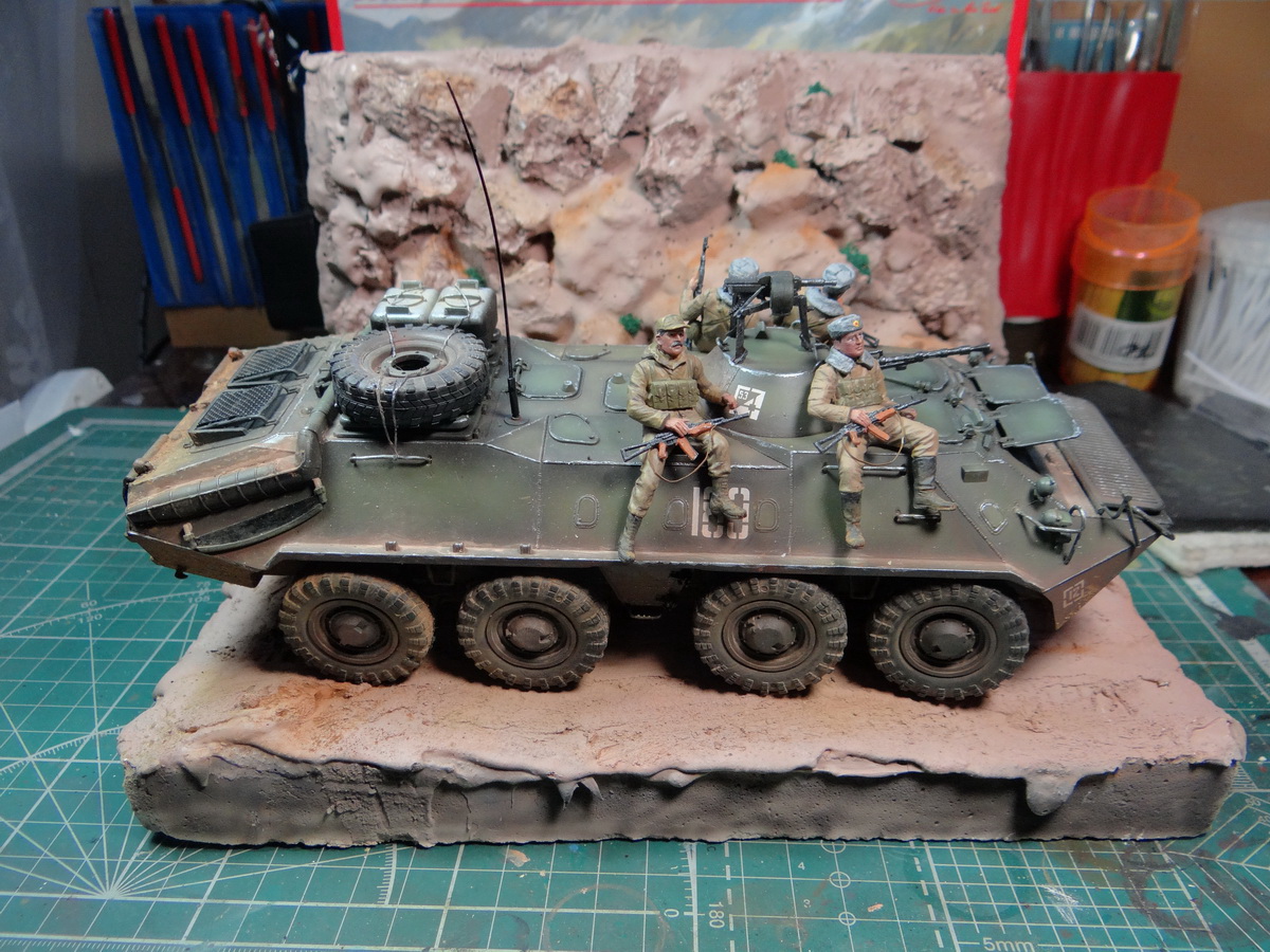 Загорелые десантники очень хорошо получились.БТР тоже покрашен профессионально. Основание интересное, сделано неплохо,только вот в некоторых местах, особенно в левом верхнем углу, пенопласт совсем уж явно виден,неровности напоминают обломок гранита, в центре скалы пузырьки маленькие, они, по-моему, выглядят не совсем естественно, но это уже совсем мелочь. Но в остальном работа отличная) Мне очень нравится) Афганская война - очень интересная тема, жалко только, что "душманов" не продают нигде. Не сделаешь диораму с полноценным боем, только если моджахедов самому лепить. Удачи в новых работах