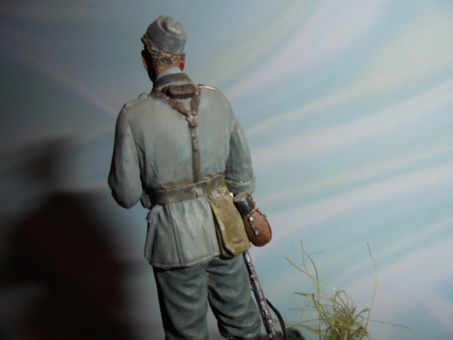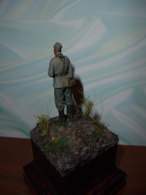 Первая любовь-это не название работы,а фигурка,открывшая долгий,фанатичный путь к качественным смоляным миниатюрам.Расписывал где-то шесть лет назад.До сих пор помню,как принес две фигурки"Альпайн" домой и два дня гладил руками аккуратные складки и ремни,боясь приступать к окраске.Помню,как испытал эйфорию от того,как краска сама ложилась на фигуру.Поэтому всем начинающим советую,ну накопите,блин,на качественную смолу или купите вместо пяти плохих одну хорошую.Не верьте корифеям,которые говорят,что тренироваться надо на..."Звезде".Потеряете время,а удовольствие не получите.Начните с"Хронос"."Эволюшен",ну и "Альпайн"со"Сталинградом".Фигурка масштаб 1:35 красилась наборами"Андреа колор",Валеджио.Ничего переделывать не стал,оставил со всеми косяками того времени.Перенес только на новую подставку.Ремни,по-моему делал из ф.т.Фигурка зацепила какой-то внутренней отрешенностью немца от этой ужасной войны.Да,и выставляйте больше своих работ в этом разделе.Не коситесь в сторону галлереи с мыслью"Я так не смогу".С чего-то надо начинать!Всем удачи!
