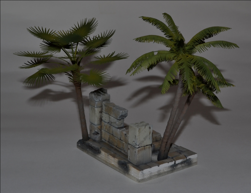 Фото о дальнейшей проделанной работе. Все каменное окрашивалось аэрографом, расписывалось темперными красками и финишно доводилось пигментами разных производителей. Пальмы ожили после такой же проведенной над ними работы. Осталась только тонировка. Работаю дальше...