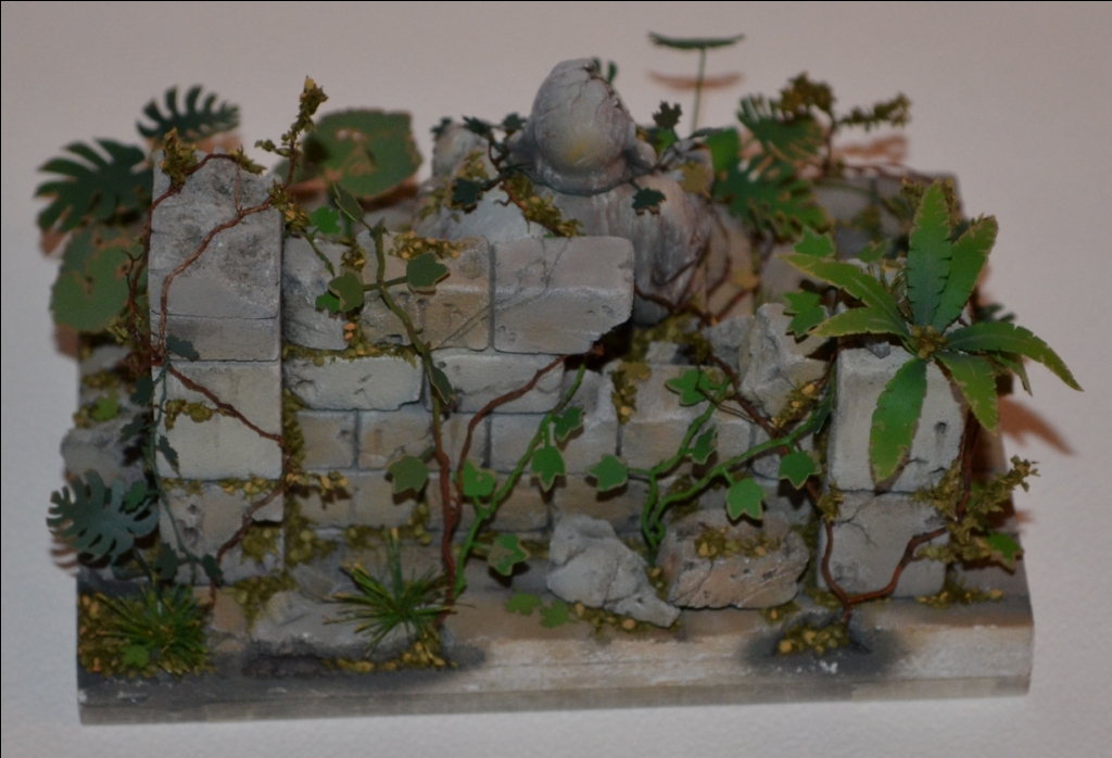 Добрый день!Очень неплохо получается.Разнообразная растительность очень оживила картинку.И даже статуя,которая мне раньше казалась немасштабной,очень гармонично вписалась.Единственное смущает стерильная чистота,как перед приездом генерала в часть. :) Мне кажется не хватает естественных природных оттенков,земляных пигментов,пыли,натуральной травки,мха.Можно было показать подтеки зеленой слизи в местах соприкосновения растений с камнем.Но,конечно,в дозированных количествах.Ну может я,правда,забегаю вперед? ;) Буду с нетерпением ждать появления фигурок,дальнейших успехов!Р/С:А куда делись красивые пальмы? :o