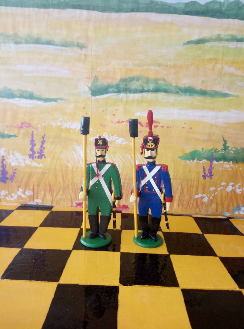 Выкладываю шахматы. Противники - русские и французы. Как и все предыдущие миниатюры сделаны из фанеры. Привожу расшифровку миниатюр.