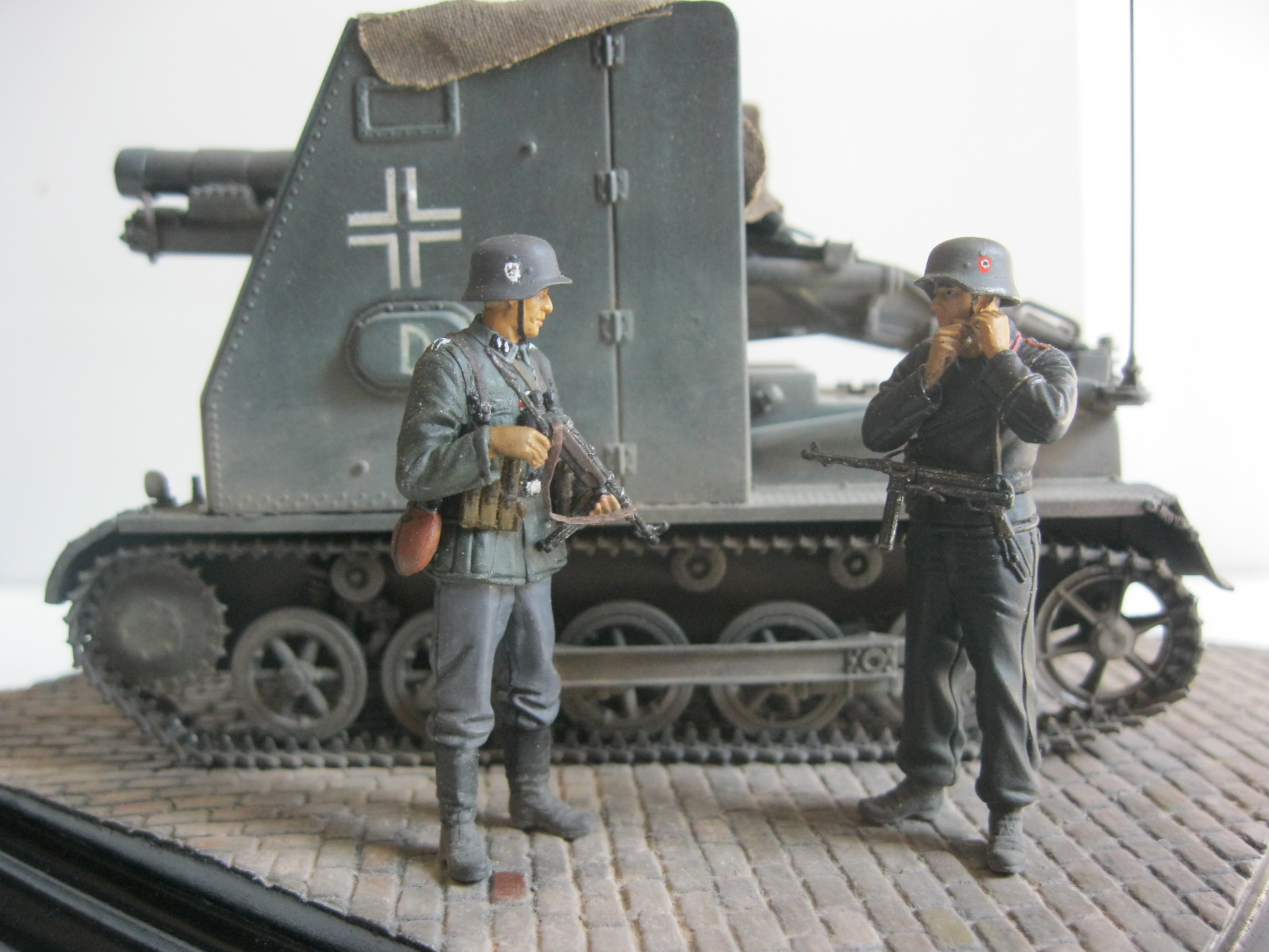 Фигурки от Dragon, подобраны для того времени. Была идея сделать именно танкиста и пехотинца. Раскрашивал форму по технологии В. Демченко (правда на танкисте не совсем видать то,чего я хотел добиться). Молнии на петлицах нарисованы вручную,равно как и свастика на каске.