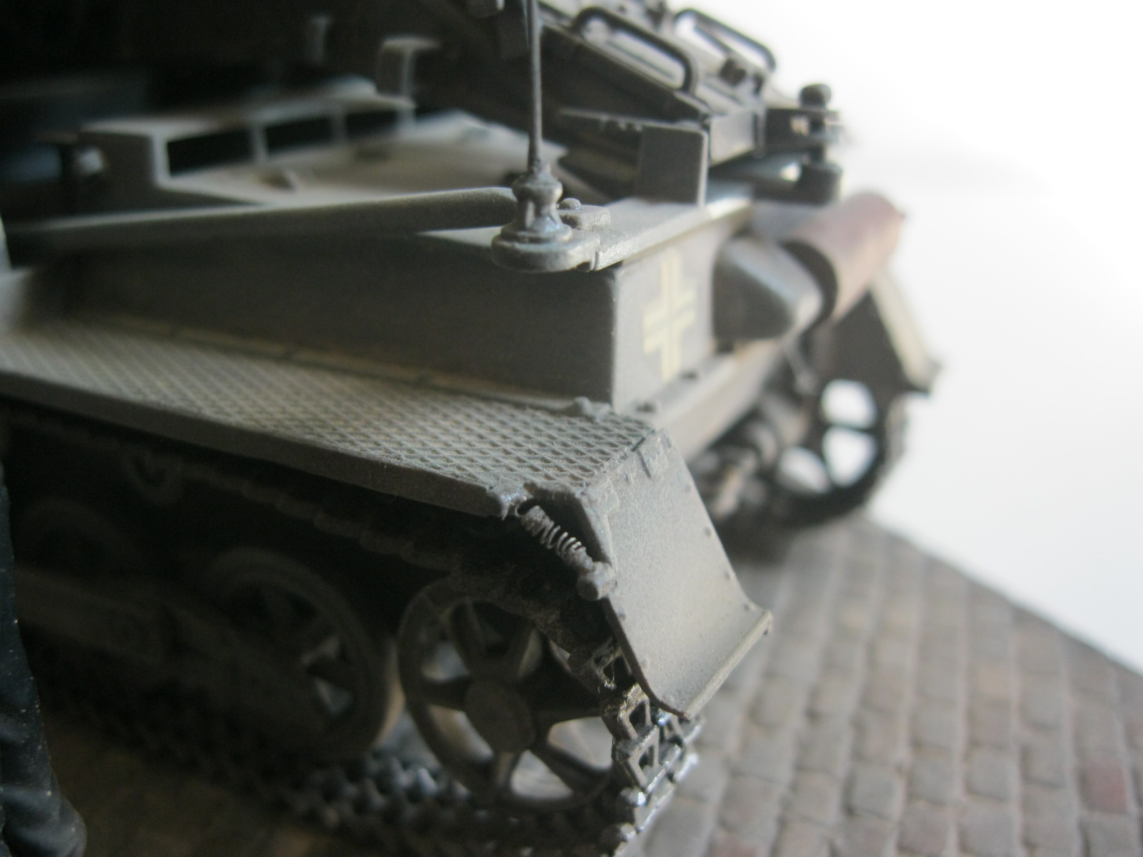 Всем Доброго времени суток! На просторах интернета наткнулся на интересную фотографию этой самоходки,воевавшей во Франции. Модель досталась мне наполовину готовая. Некоторые детали были утеряны,а некоторые пребывали в ужасном состоянии. Заново сделан щит и ствол гаубицы, пружинки для задних подкрылок самоходки, заменены поддерживающие катки (у всех катков из набора было смещено отверстие для приклеивания на модель),добавил самодельный трос,брезент-парусина,вырезал трансмиссионный люк. Ствол гаубицы-точеный на станке самостоятельно,заглушка-из тонкого полистирола.