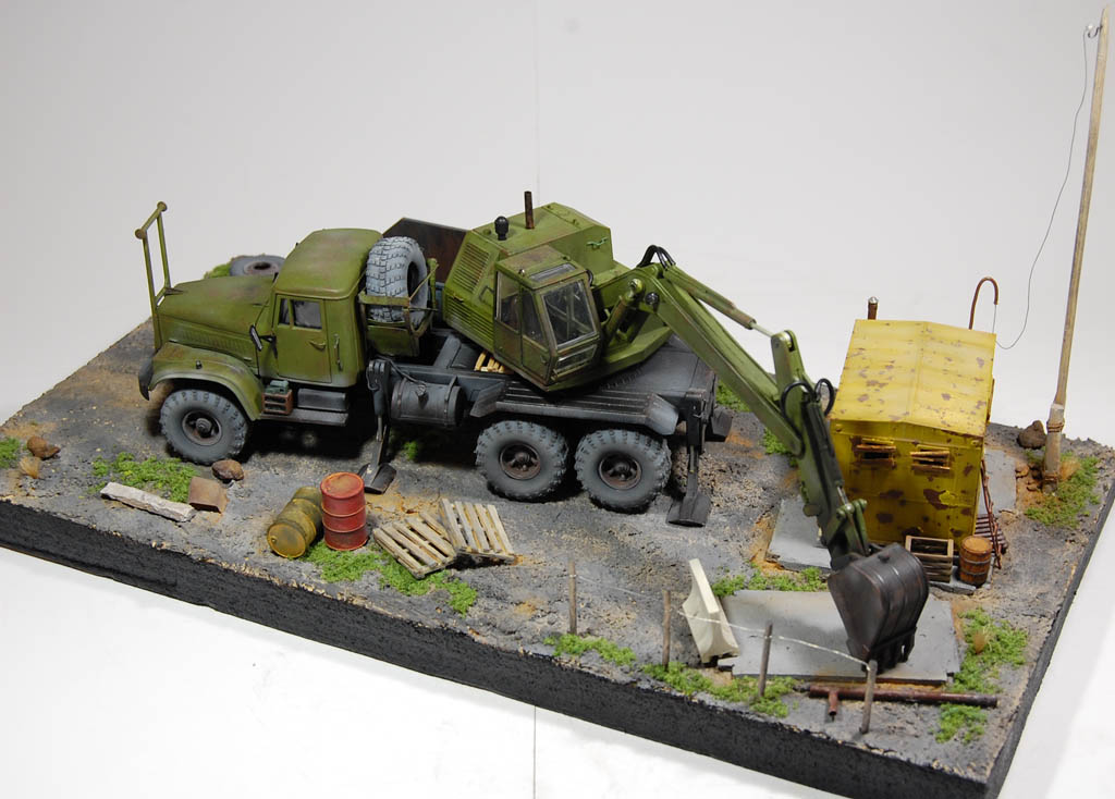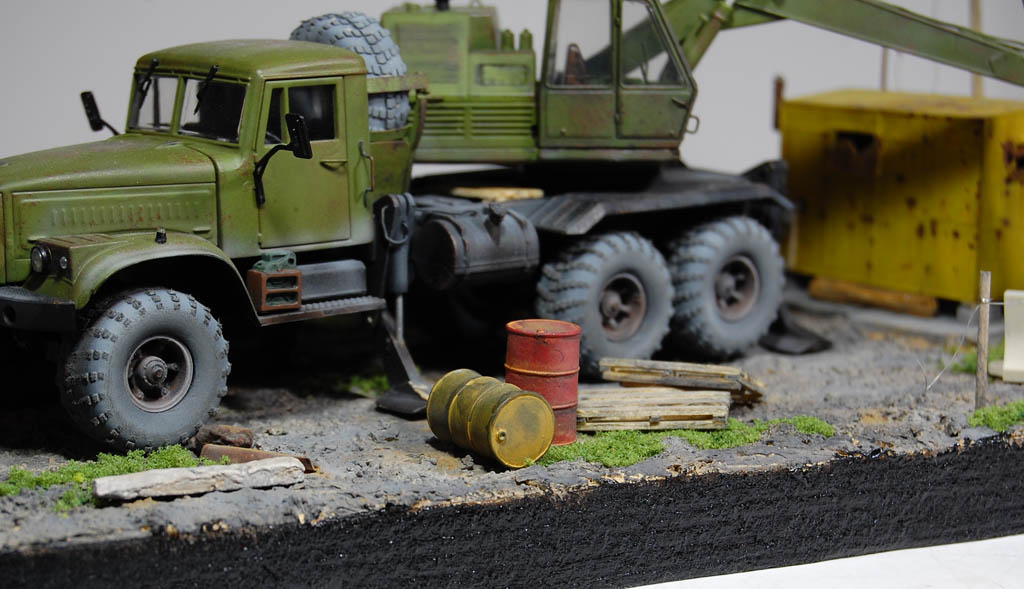 Здравия всем!Собрал подставку с Кразом за пару месяцев,процесс меня порадовал!Использовал материалы:Пенополистирол,шпатлевка по дереву,песок обычный,красилось основание Гуашью,модель Краза,бытовка и контейнер красились Тамией и солевым методом.Плюшки от АВД:бытовка,контейнер,колесо,от Опуса:2 бочки,ящик и дорожный блок.Столб самодельный-приставки из худ.глины а сам столб из шпажек для шашлыка.Ссылка на видео обзор https://www.youtube.com/watch?v=zh4U5M3X-Xs