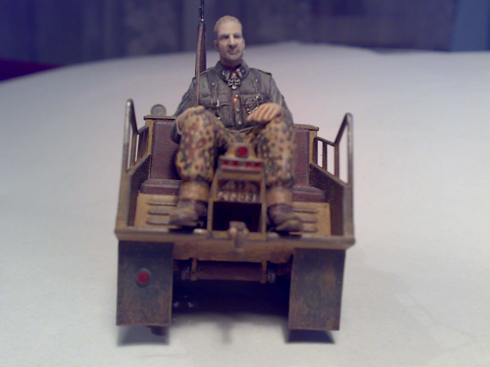 Неплохо сделано. Хотя Ketten еще не попадал в сферу моих интересов :) думаю, что оживить грубоватенькую тамиевскую модель могла бы какая-нибудь дополнительная деталировка, вроде проводки в районе руля. Ну и для настроения можно подложить в кузов что-нибудь такое, что могло бы как-то охарактеризовать персонаж (это, если будет виньетка). Не знаю как у гансов было по уставу :) но мне так ехать с винтовкой было бы неудобно. Я бы ее положил на колени или поставил бы прикладом на ступеньку между ног.