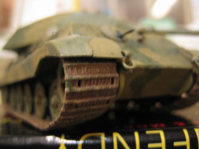 И общее замечание по гусеницам. При движении танка все выступающие участки траков обдираются до блеска. Поэтому надо было методом "сухой кисти" пройтись по гусеницам стальным цветом (не путать с алюминием!). Операция простенькая, а эффект - потрясающий!