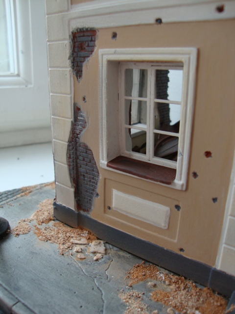 Соглашусь с ранее сказаным, стены домов слишком чисты как для уличного боя. С наружной стороны не помешало бы следов пуль, осколков, трещин (так как судя по разрушениям в дом (или где-то рядом) упала авиабомба. На стенах (в местах где отбита штукатурка) кирпич можно сделать на несколько оттенков, не всегда его использовали строго одного цвета. И не исключается версия пожара после авиа налета, т.е. закопченности, следы сажи над рамами, ну и как следствие внутренняя часть домов (квартиры).