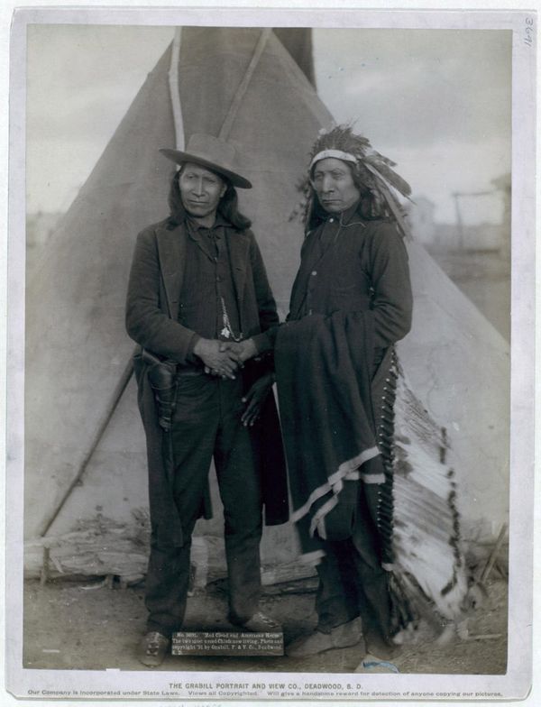 Портрет известных индейских вождей племени Оглала. Красное Облако (в традиционном головном уборе из перьев) пожимает руку своему зятю Американскому Коню (в европейской одежде и с кобурой). В 1866—1868 годах Красное Облако вел войну, результатом которой стал мирный договор на достаточно приемлемых для индейцев условиях. Снимок сделан в резервации Пайн Ридж в 1891 году.