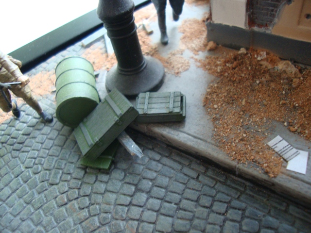 Гадте, гадте и ещё раз гадте. Разбросанные листики смотрятся вообще нелепо. Бочки и канистры помять и продырявить, гилзы перенести туда, куда они вылетают из казённика. Побольше копоти, сухой грязи, имитации битого стекла и пыли. На зданиях попробуйте технику маслянных пятен коричневых оттенков (самый доступный и простой способ, а эффект шикарный). Если уж взялись за такую работу - посмотрите как делают мостовую (практически все камни имеют разные оттенки). Плотно попользуйте пигменты или пастель. Сами увидите как изменится работа. Тем более, что Вам это всё уже писали.