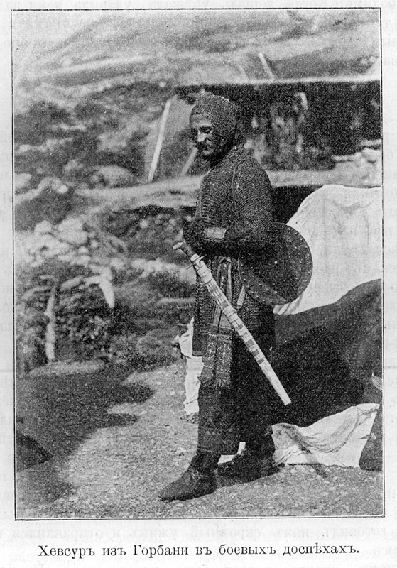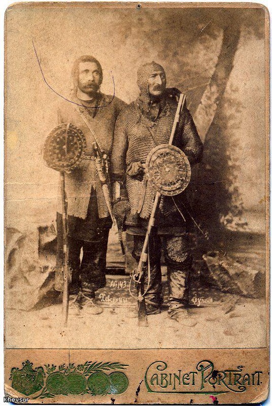 На выложенных фото хевсуры вполне реальные - фотографии конца 19-го - самого начала 20-го века, сделаны прямо в селениях, никакой постановки. А кучу оружия горцы Кавказа всегда на себе носили - и в бою пригодитмя, и понтово...