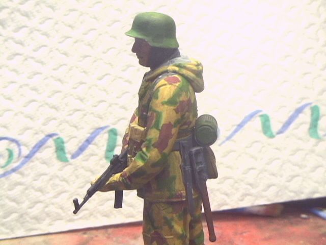 Вы там тени вообще-то выделяли или я просто ничего не вижу? Пятна камуфляжа не высветлены, складки не показаны. Насколько мне известно в 1/16 масштабе это вполне возможно сделать. Хотя Тамиевская фигура это смола и не метал, но все же. Я так понимаю, это еще не законченая работа?