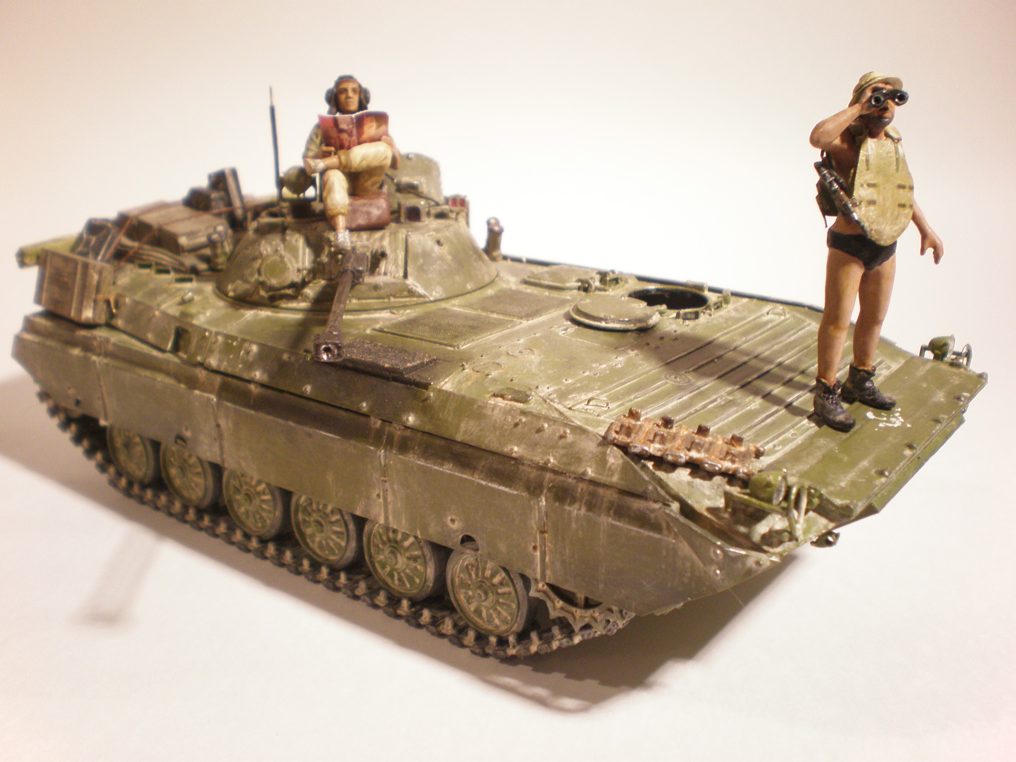 Очень хорошая работа для пробы пера в 35-масштабе. К неточностям, указанным в предыдущем посте, можно добавить излишне зеленоватый оттенок бревна на корме машины (в сухом Афганском климате плесневеть ему не с чего); БМП обычно имела довольно дымный выхлоп, оставлявший хорошо заметные пятна сажи на правом борту (на модели это выглядит больше как пятно грязи, можно закоптить это место посильнее); журнал в руках бойца зеркально перевернут (хорошо заметный логотип "Огонька" советских времен находился на первой, а не на последней странице обложки!); отсутствует бортовой номер машины.