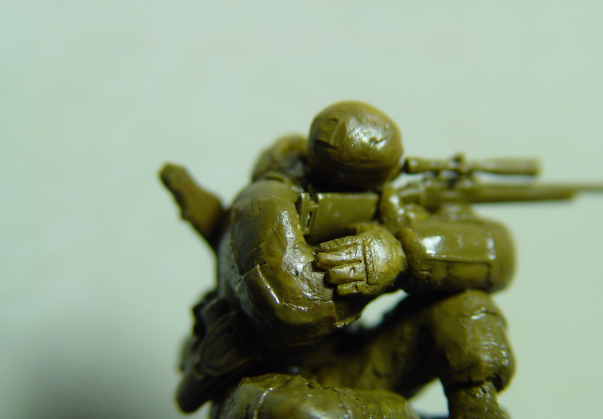 .........материалл Артефактовская пластика, скажу сразу , что остался вполне не доволен самим материаллом, даже после нескольких запеканий отдельные части фигурки продолжали крошиться и просто отваливаться.С горем пополам доделал. Оружие и амуницию использовал от разных фирм производителей. От меня лепка самой фигурки и кой какие ремни. Особой привязки к форме и правильности амуниции не было, была задача-попробовать своё умение в лепке.
