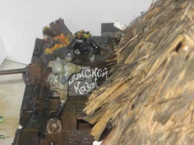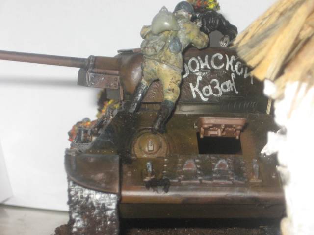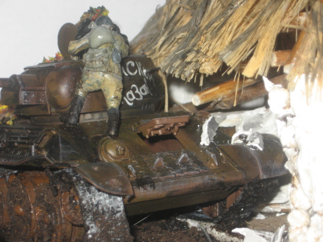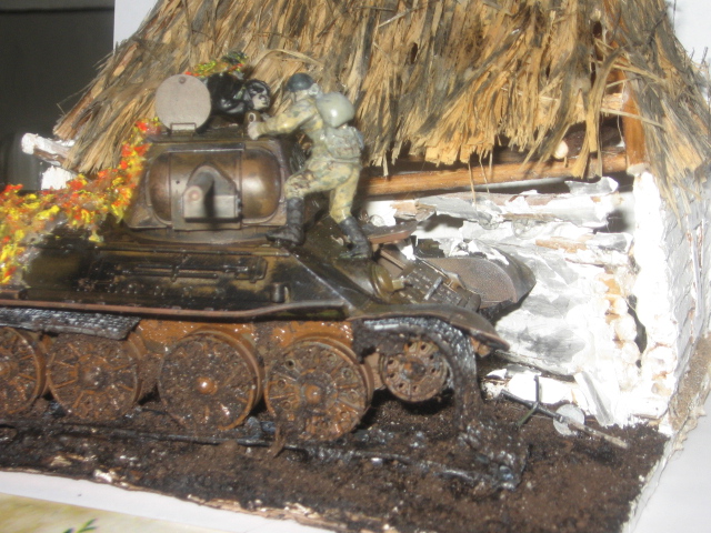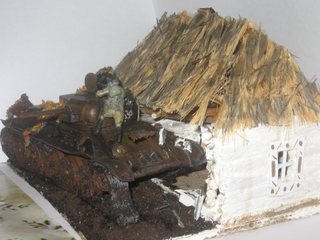 Выставляю на ваш суд свою диараму, навеянную мыслями о Великом Дне Победы, масштаб 1:35. Использовал модель Советского среднего танка Т-34/76, для персонажей использовал танкиста Красной Армии и пехотинца Красной Армии, все модели фирмы "Звезда". Дом сделал из сушёных стеблей больших цветов, крыша - щётка для побелки. Внутри дома есть русская печка, стол и лавочка, если внимательно посмотреть через окно (фотоаппаратом это показать не удалось). Огонь - герметик, подкрашенный красками.