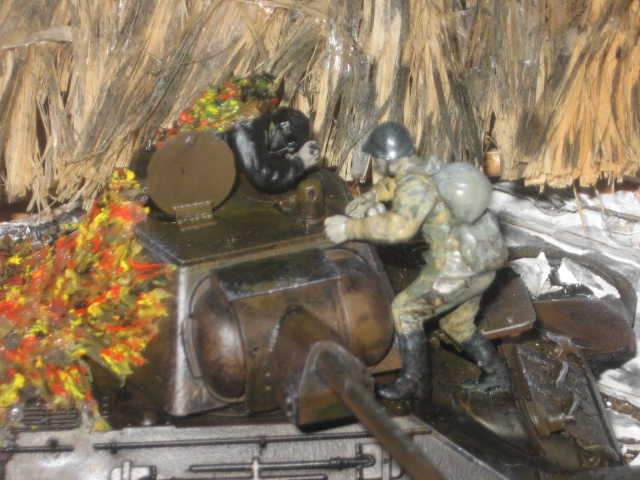 Учитывая свой крошечный опыт мне как-то неловко делать замечания, но на фигурке помоему плохо удалены остатки литника, да и цвет рук и лица не понятен, какой-то зеленый что ли, подсумок и мешок покрашен в один цвет, что не очень хорошо. А в общем работа проделана большая мне наверно пока терпения техники не хватилобы на такой размах. По танкам не спец, но что это за желто-красная "клякса"? И Какие краски Вы использовали в работе?