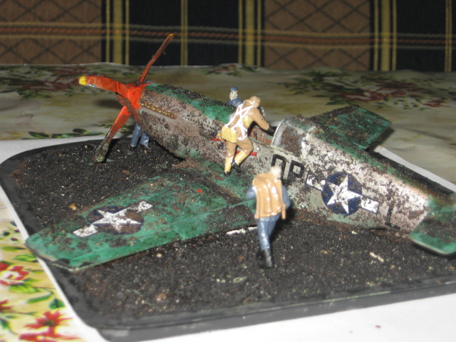 Предлагаю на Ваш суд мою очередную диараму, в которой использовал модели фирмы "ICM"- "Мустанг Р-51С" и "Пилоты и техники истребительного командования ВВС Великобритании (1939-1945)" масштаб 1:48. Самолёт загрунтовал автомобильной грунтовкой, покрасил красками фирмы "Звезда", пришлось поломать шасси и винт в связи с задумкой диарамы. У техника, который тащит за собой баллоны с воздухом, добавил шланги. Основа-гипс, покрытый земля+клей ПВА+лак по дереву (для придания эффекта мокрой земли).