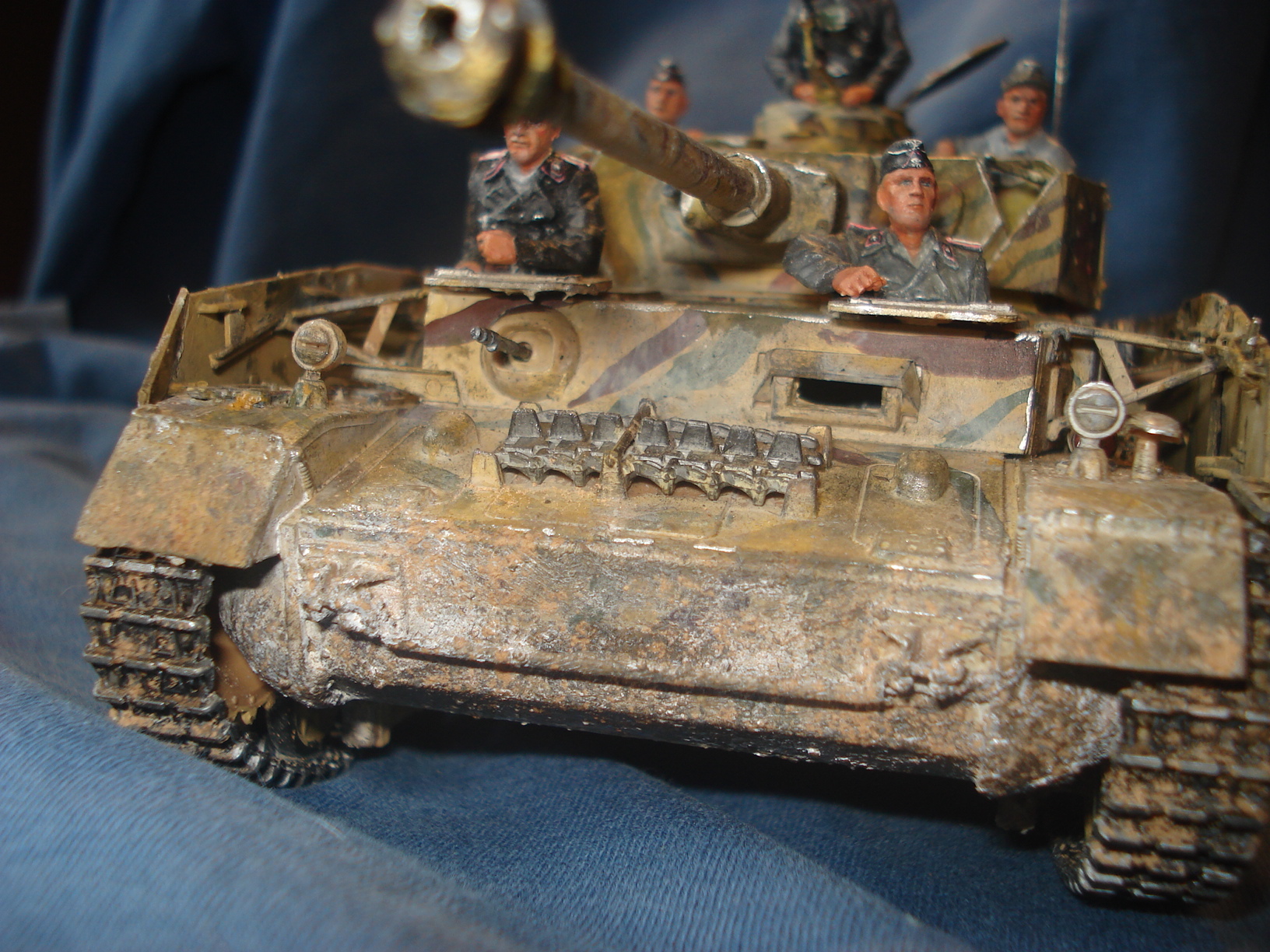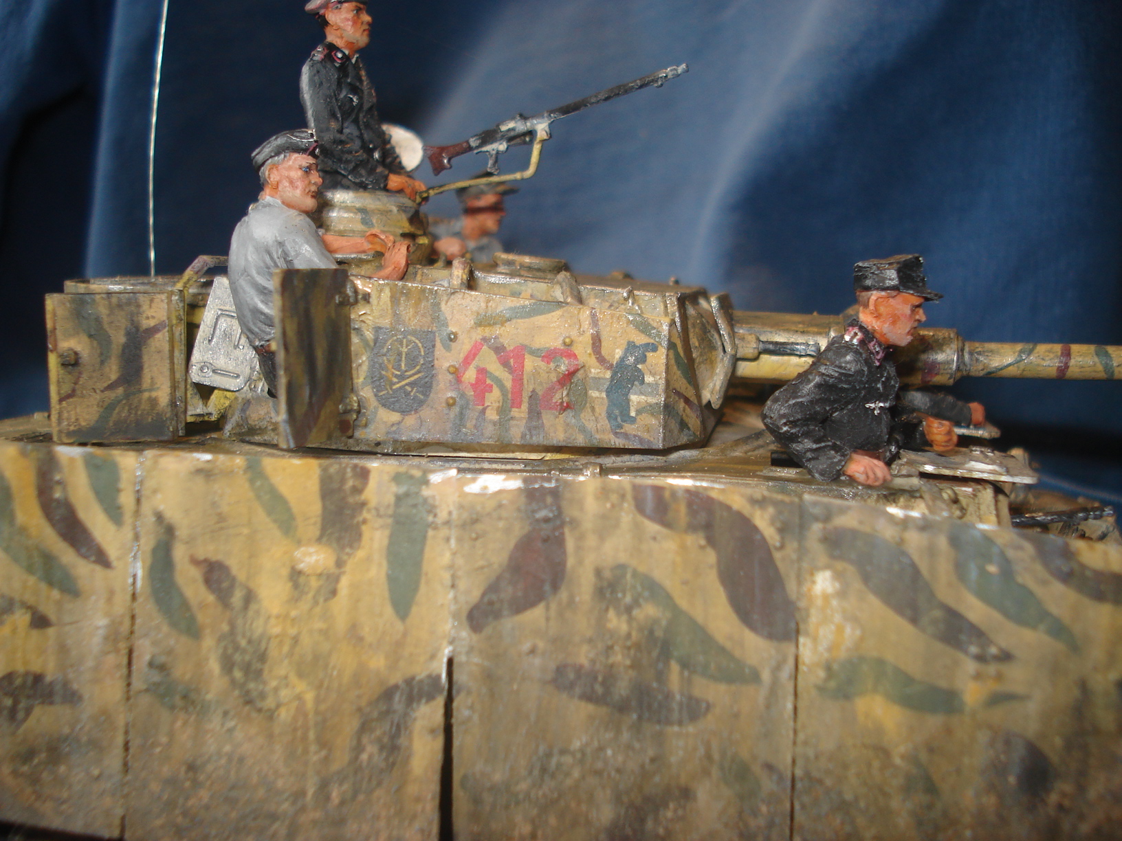 Ну что тут скажешь. Самое лучшее, что получилось в этой работе - это канты на форме танкистов, довольно аккуратно. У фигурок не везде зачищены швы от прессформ, также все портит какая-то непонятная белесость, возможно от перебора матового лака. А так, учитывая дубовость данного набора фигурок, вполне неплохо. Танк выглядит намного хуже. Если даже не смотреть на матчасть, окраска явно подкачала. Во-первых, очень толстый слой краски и лака, во-вторых, неестественные загрязнения - корма, как будто оплавилась. Сколы до белого метала неестественны. Постарайтесь приобрести аэрограф - половина проблем отпадет. Деки наклеены от балды - изучайте прототипы по историческим фото. Удачи.