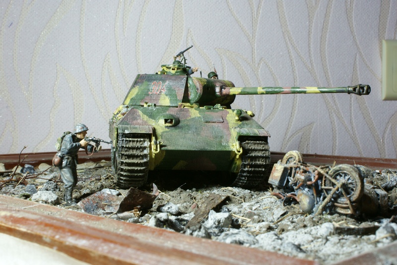 пантерка чистовата для такой "грязной" диорамы,фигурки блестят,незаделаны стыки рук с туловищем + гусеницы мог бы хотяб к колесам приклеить(сверху)