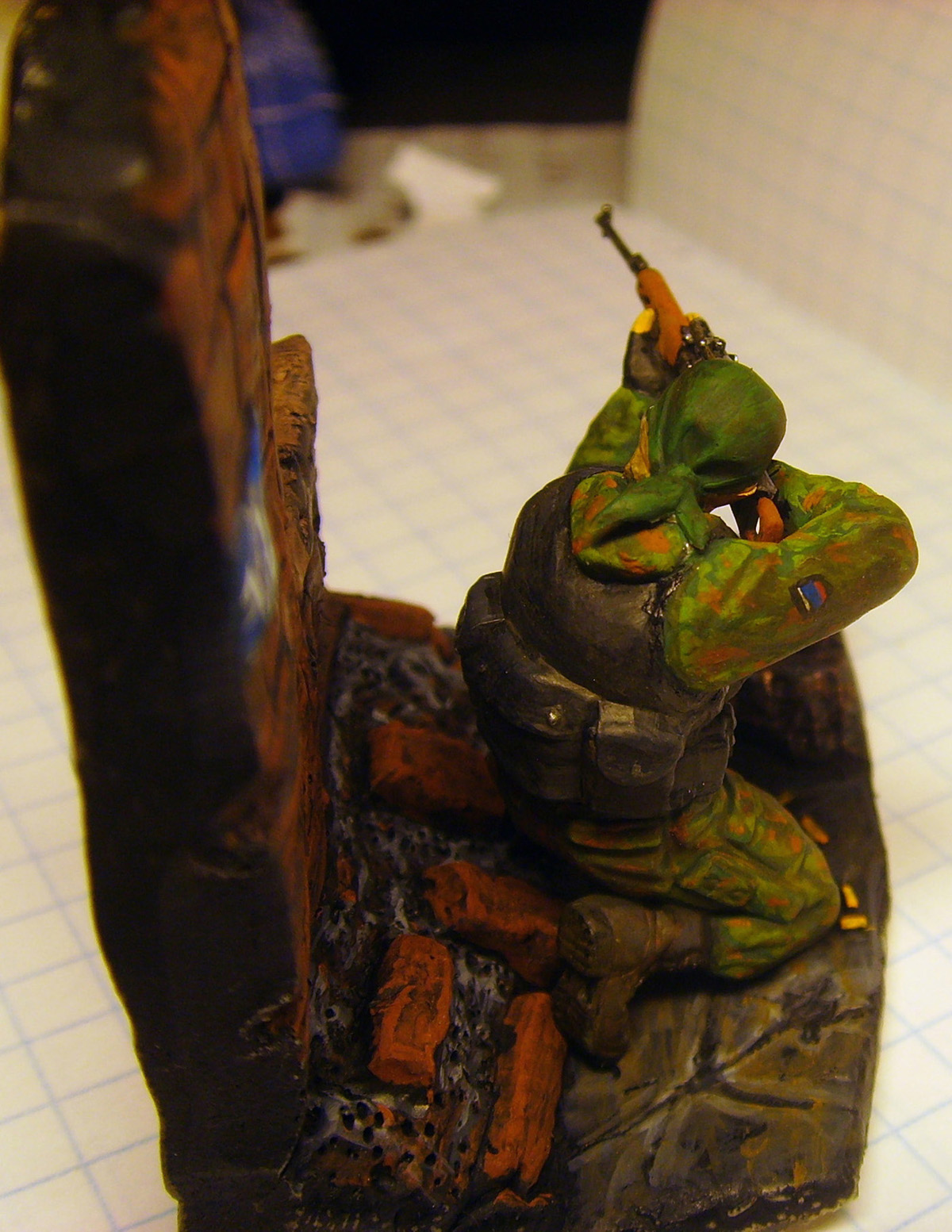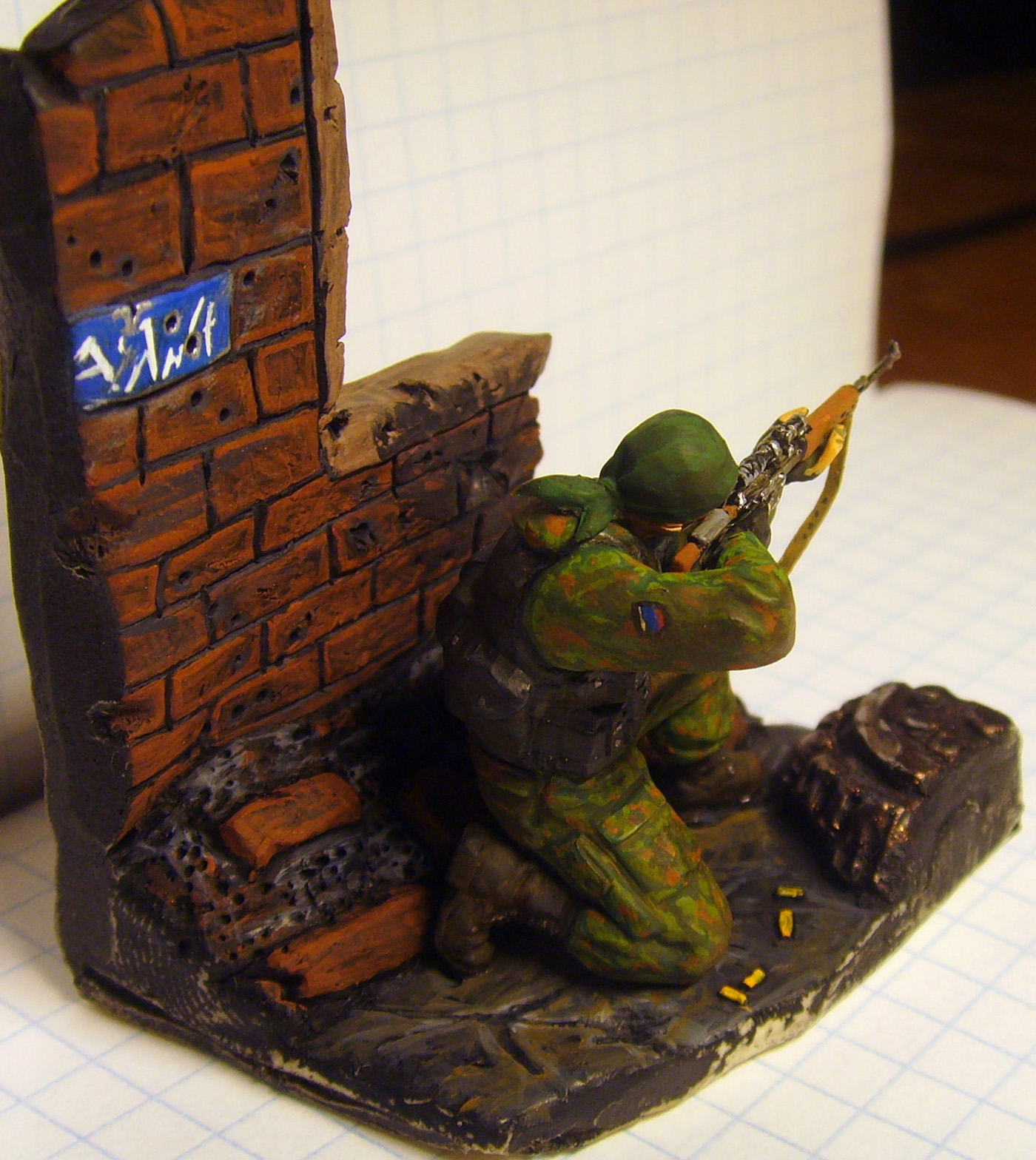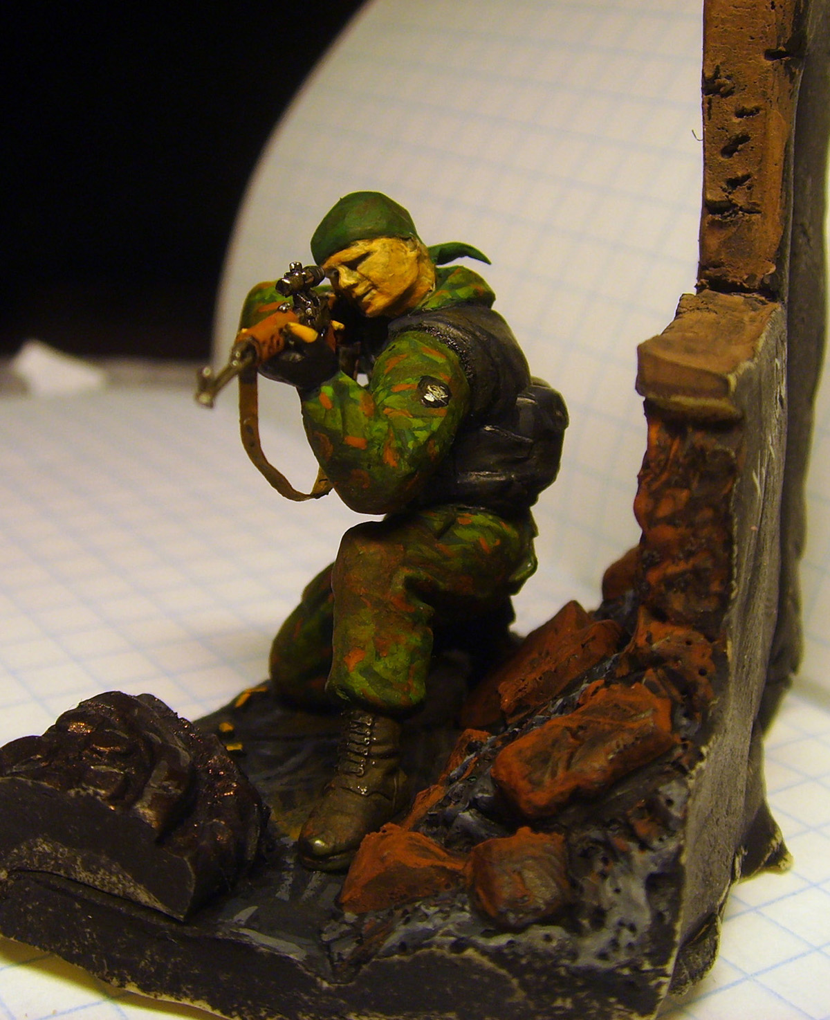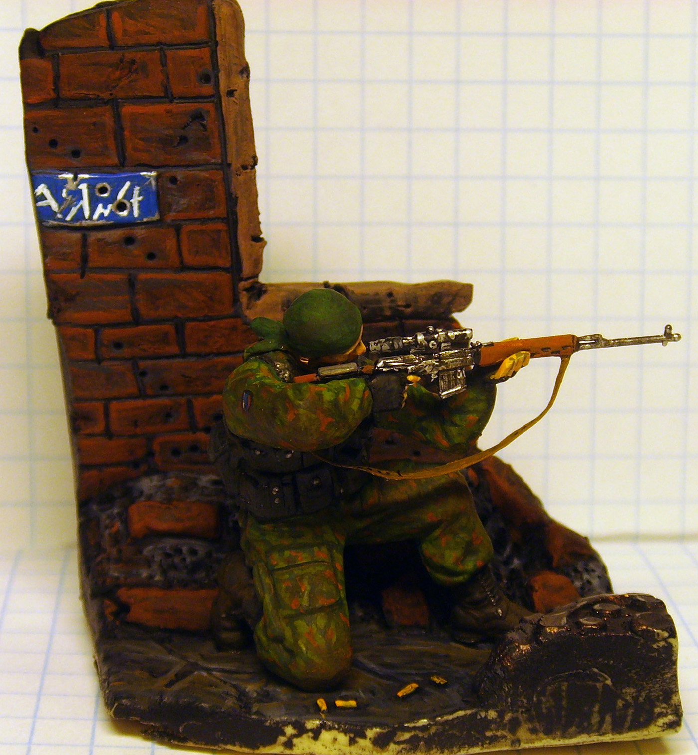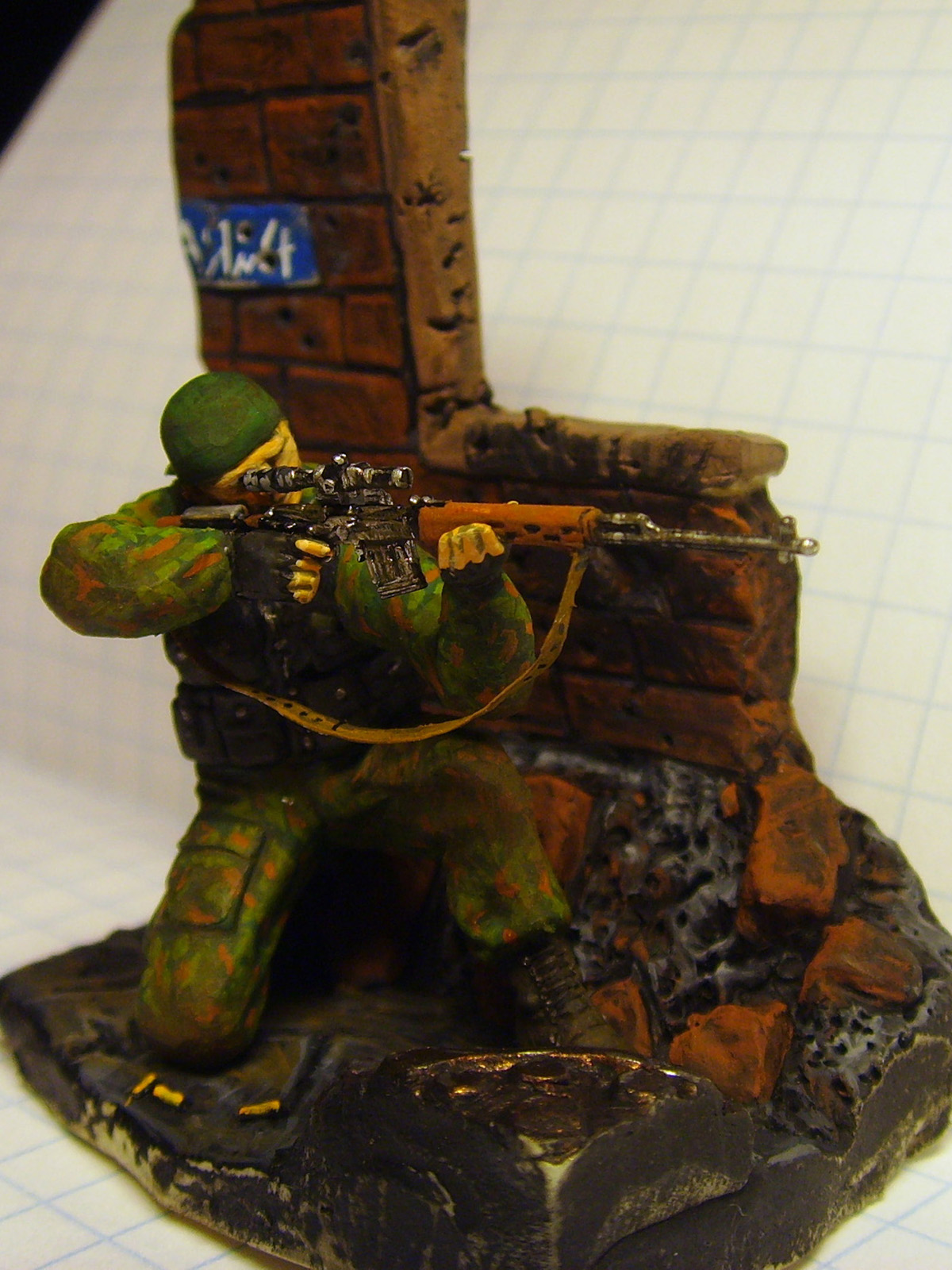 Использовал: Снайпер из набора Спецназ от "Звезды", фон сделал сам из пластики. ремень свд из свинцовой фольги. Покрашенно темперой "мастер класс" и акрилом от "Games Workshop"