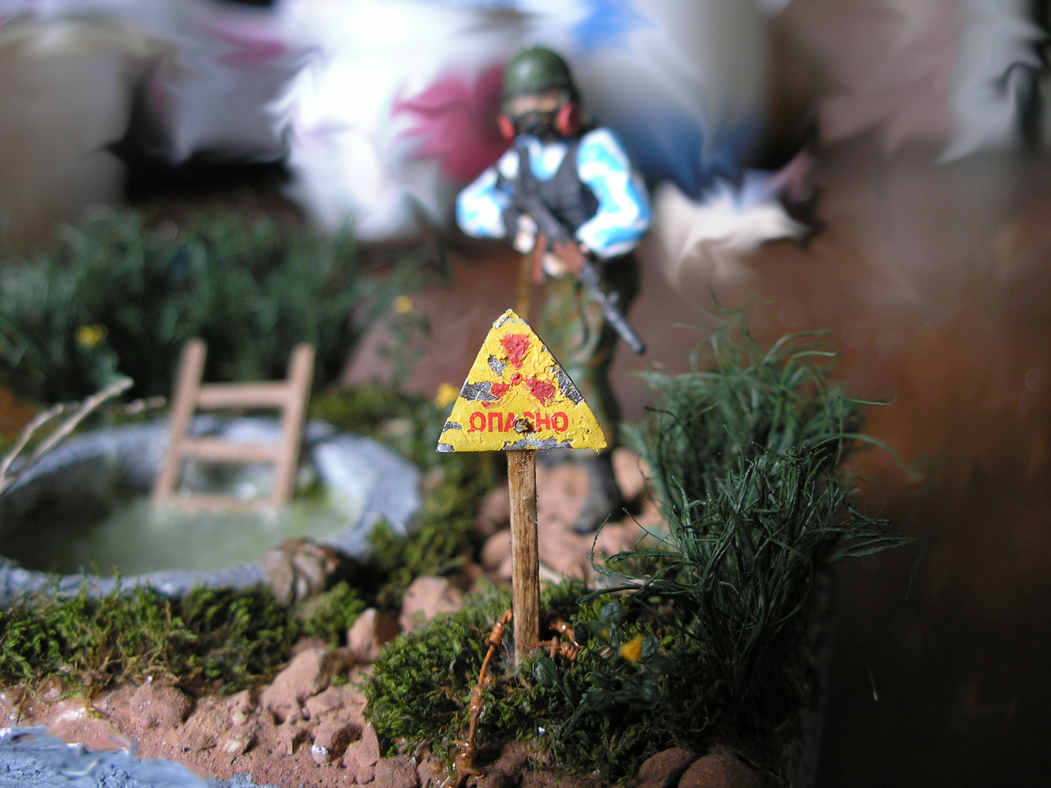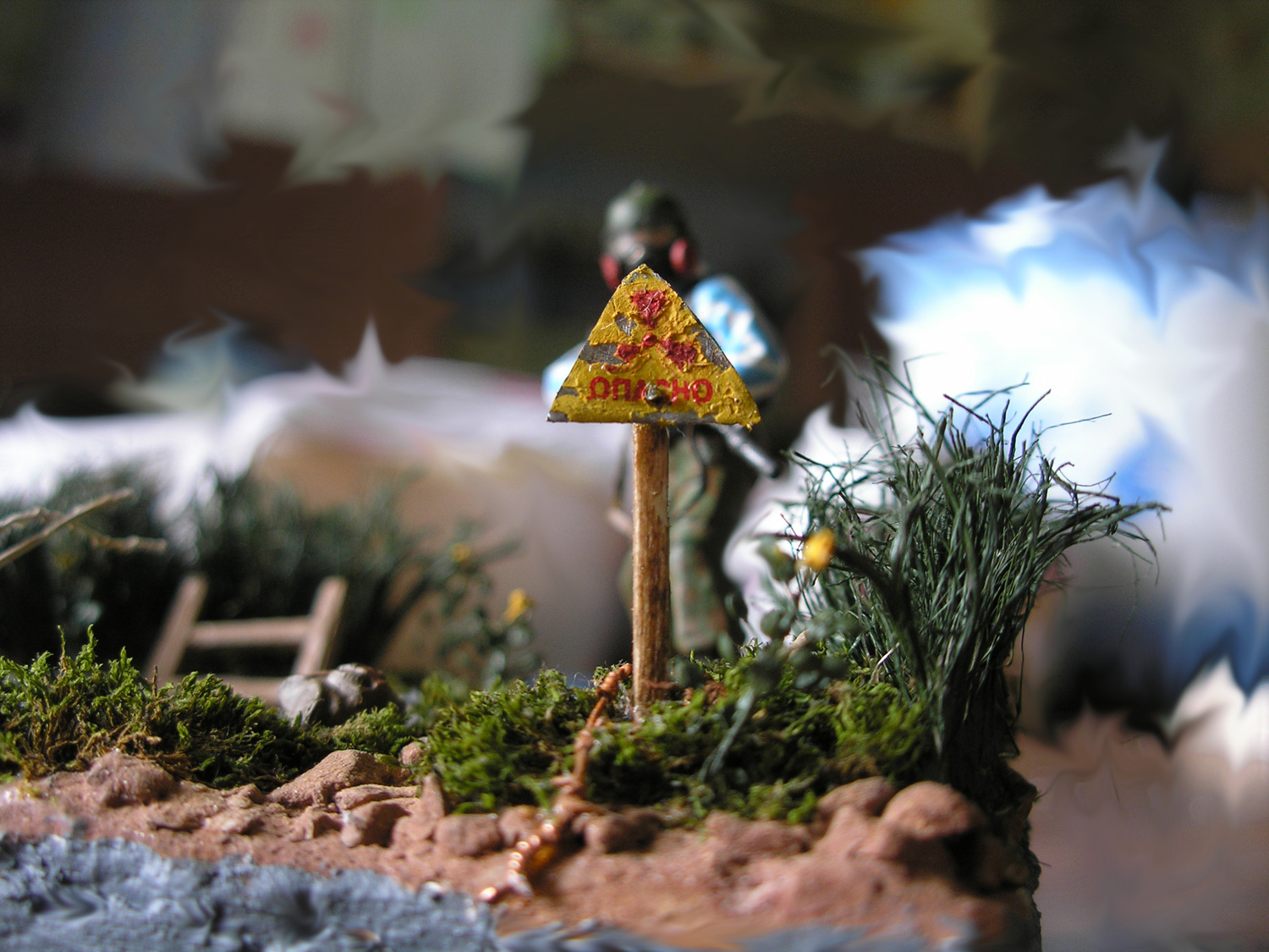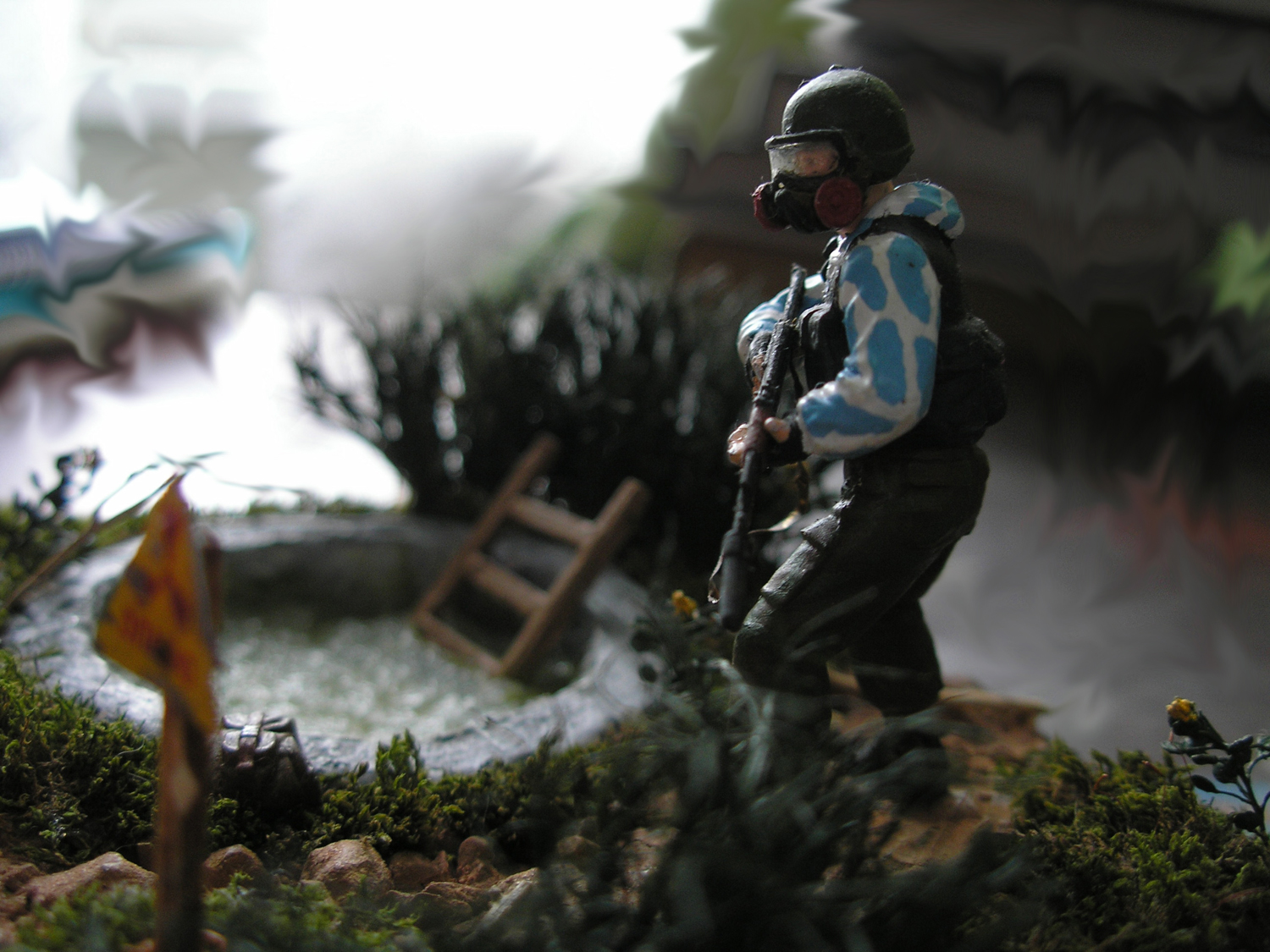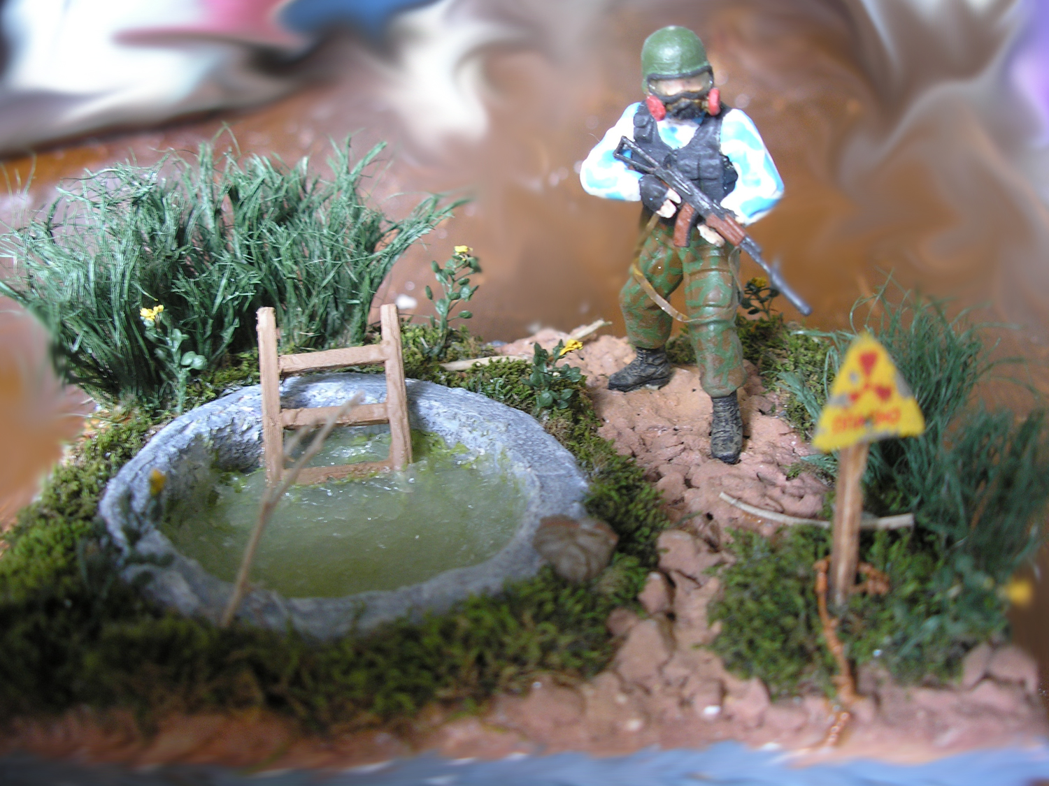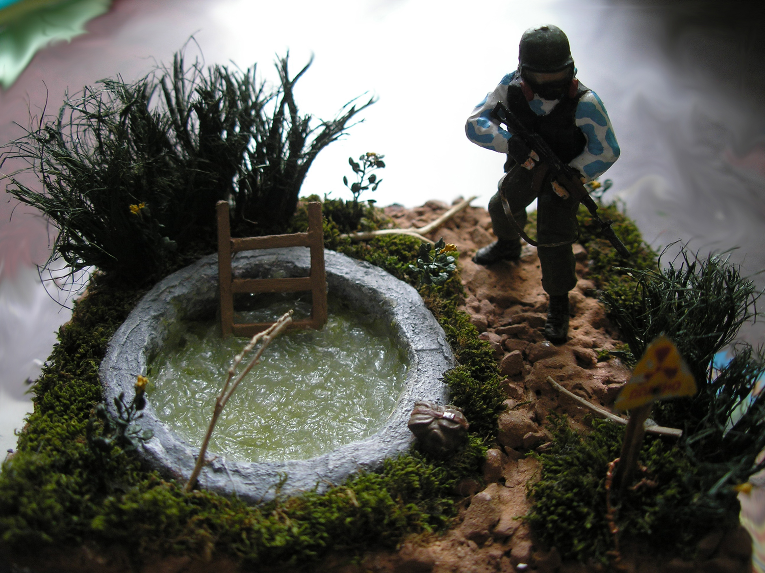 ) ... что безусловно понравилось это растительность и цветочки - действительно, очень редко встретиш их в работах моделистов. Рюкзаку на краю колодца приделать лямки, а то уж слишком он похож на камень. Деревянную стойку знака радиации заменить на металическую.
