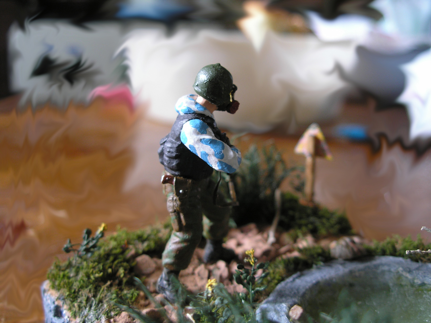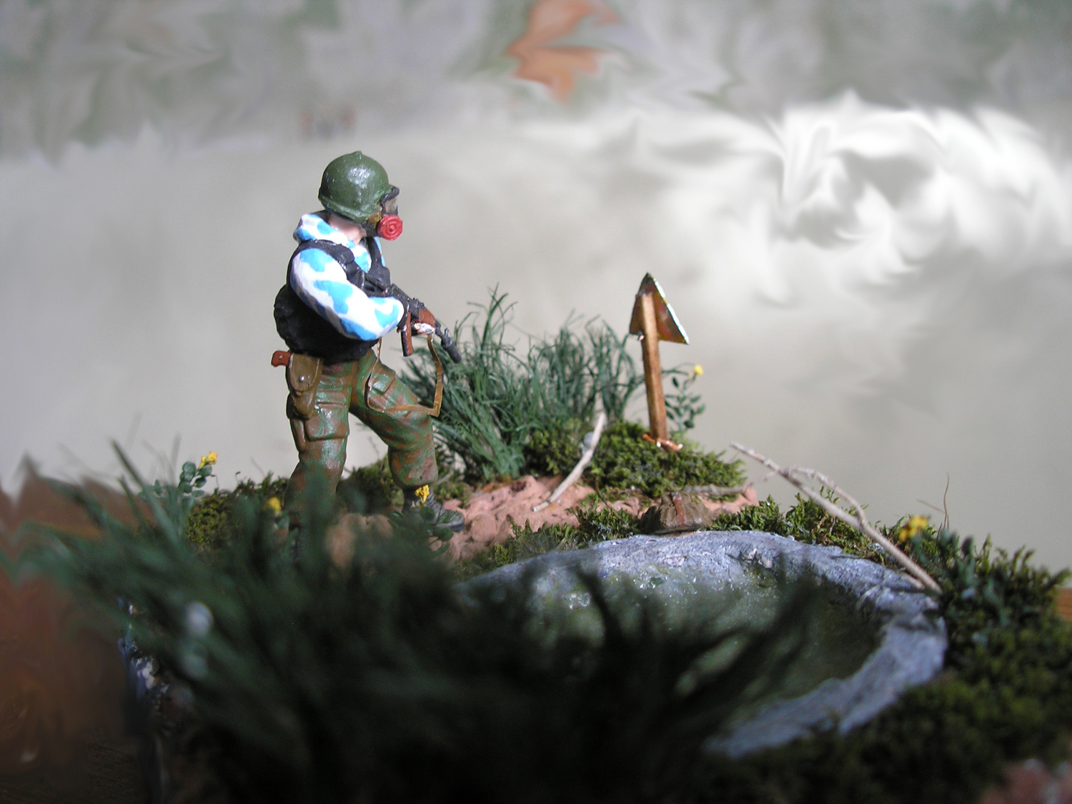 Оч.понравились вода и потоптанный песок, трава тоже живенькая. Фигурка, честно говоря, не совсем: порты блестят, рубашонка какая-то дикая, ДЕмаскирующая... Правда, я и сам вечно борюсь с соблазном изваять нечто дикое, типа в кислотный горошек. Но всё это дело наживное.