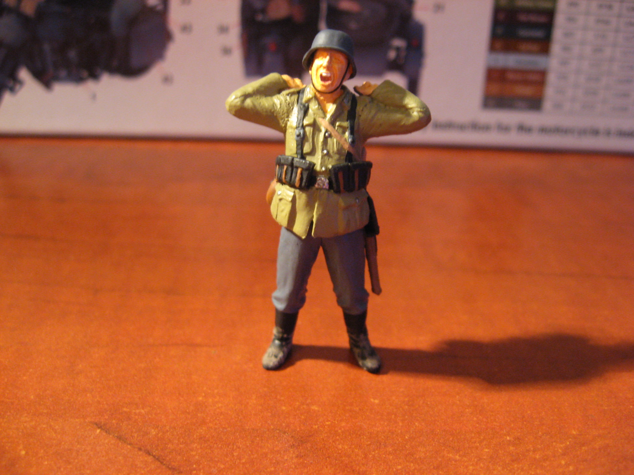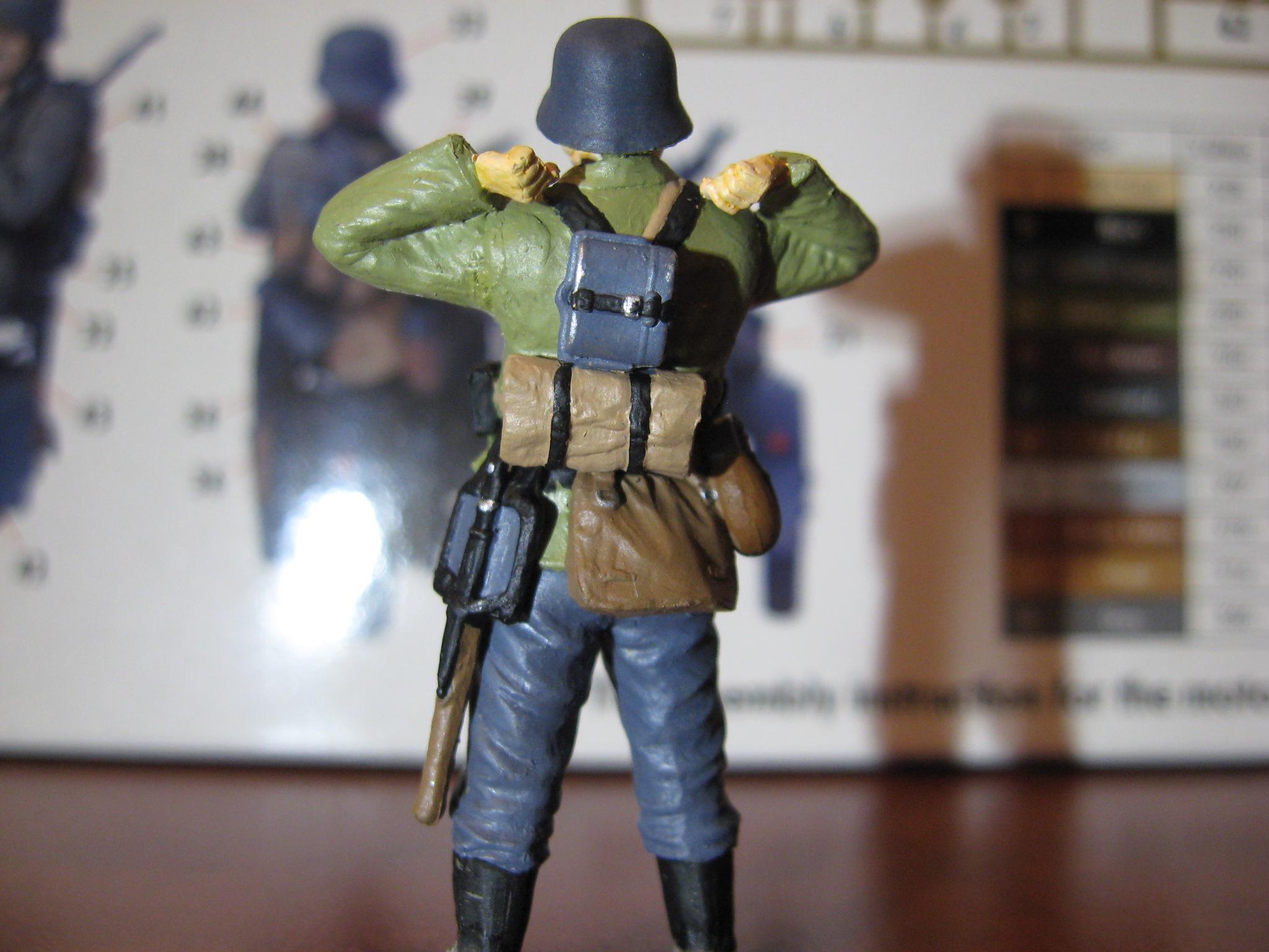 фотки конечно ужасные и трудно что-то разобрать,но попробую оценить: аккуратно-это плюс,котелок и китель не того цвета, фляга висит не на своём месте.она крепилась за колечки на сухарке,это начало войны,поэтому нелишним щиток на каске намолевать,фигурка блястить-это минус,нет работы с тенями,тонировку лично я вообще не вижу,вот смотрите и учитесь как оно должно быть: