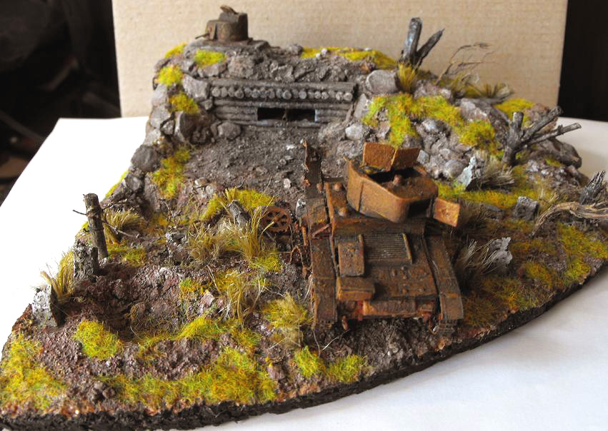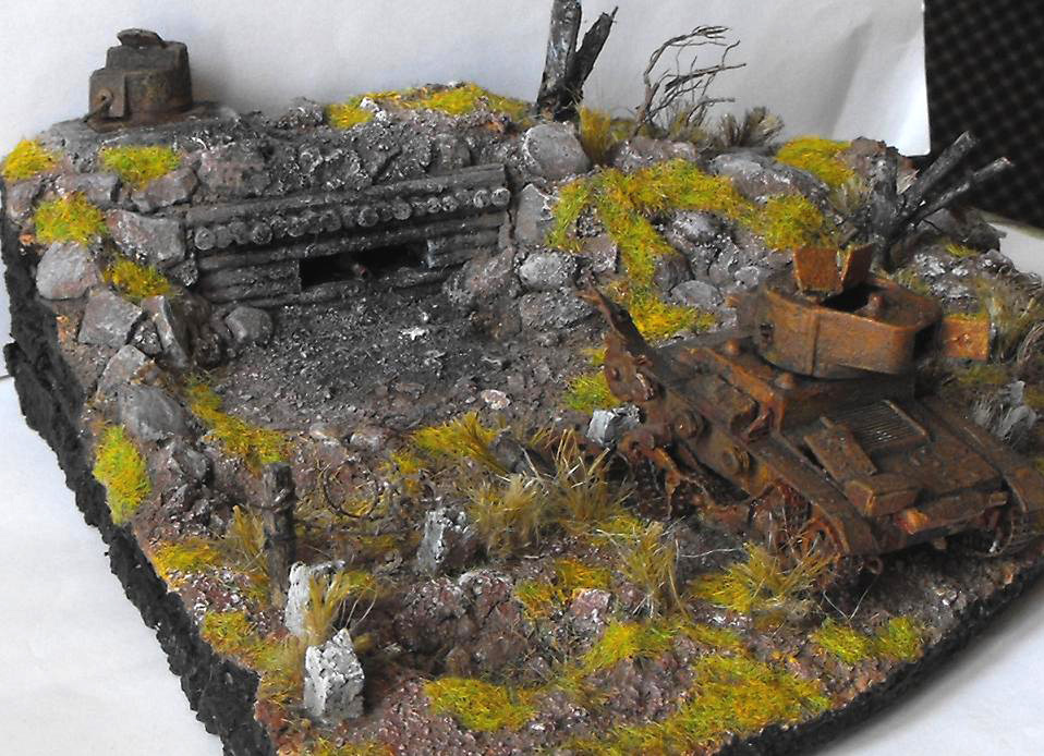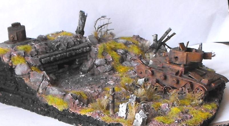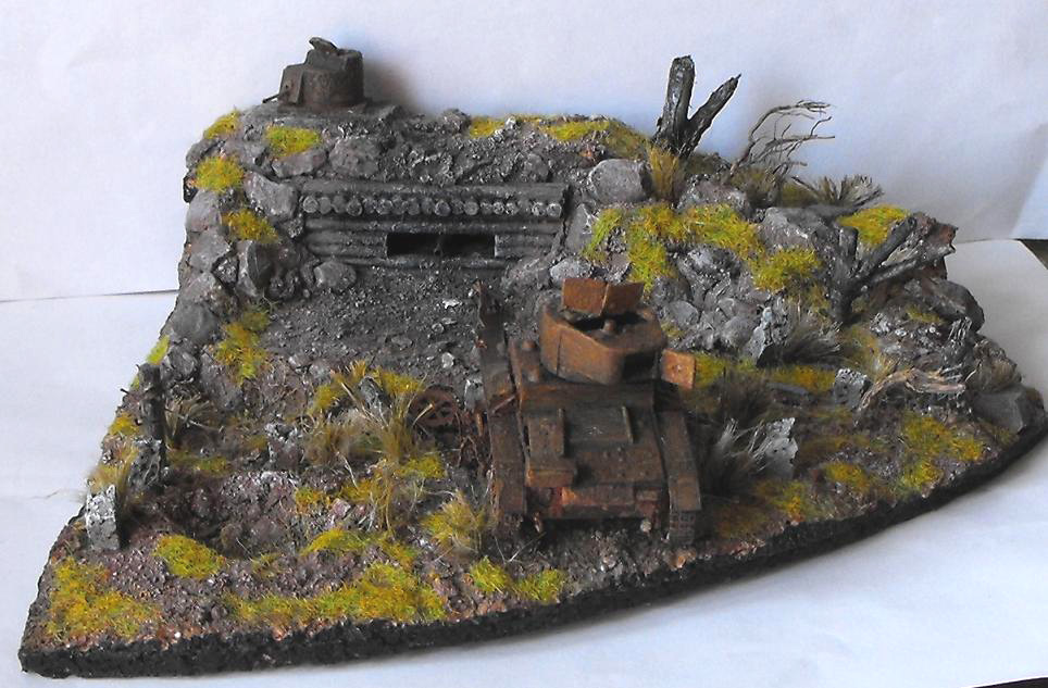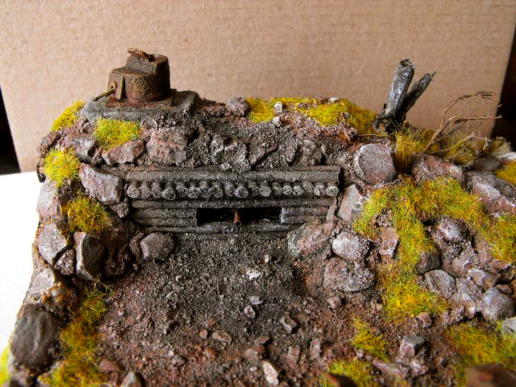 Подставка - листы прессованой пробки. Надолбы - тоже пробка. Дот самопальный, из литников, бронеколпак на доте - башенка от 2-х башенного Т-26 той же фирмы.