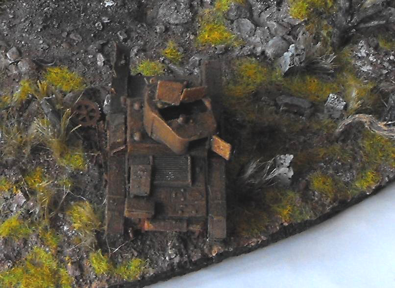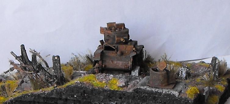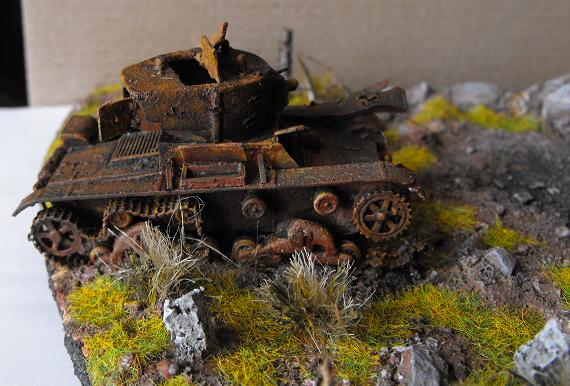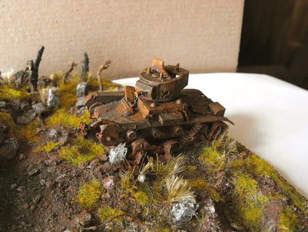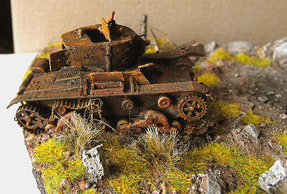 С самого начала решил, что нормальный вид горелому танку и бронеколпаку придаст только рыхлая, объемная ржавчина.Визуально помню, что прогоревшие в огне массивные железяки ржавеют отслаивающимися хлопьями, причем цвет меняется от темно-ржавого до ярко-желтого. Это и пытался воспроизвести. Делал я это так. Выбранные места поверх основного цвета (Ржавчина, "Звезда", акрил) покрывал точками и маленькими участками зубочисткой матовым лаком, поверх него присыпал мукой, излишек сдувал. После высыхания "наросты" прокрашивал основным цветом. Потом покрывал смывкой, а после высыхания - слегка тонировал сначала ржавчиной, потом, поверх - желтым.