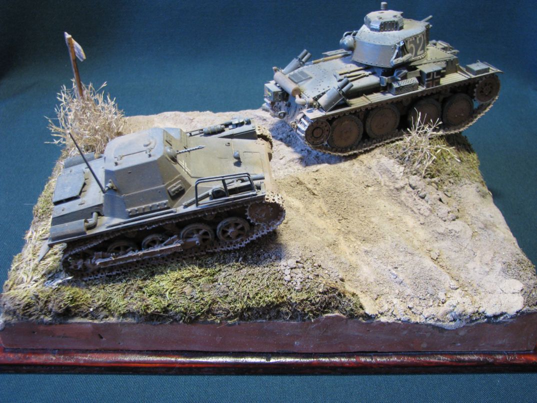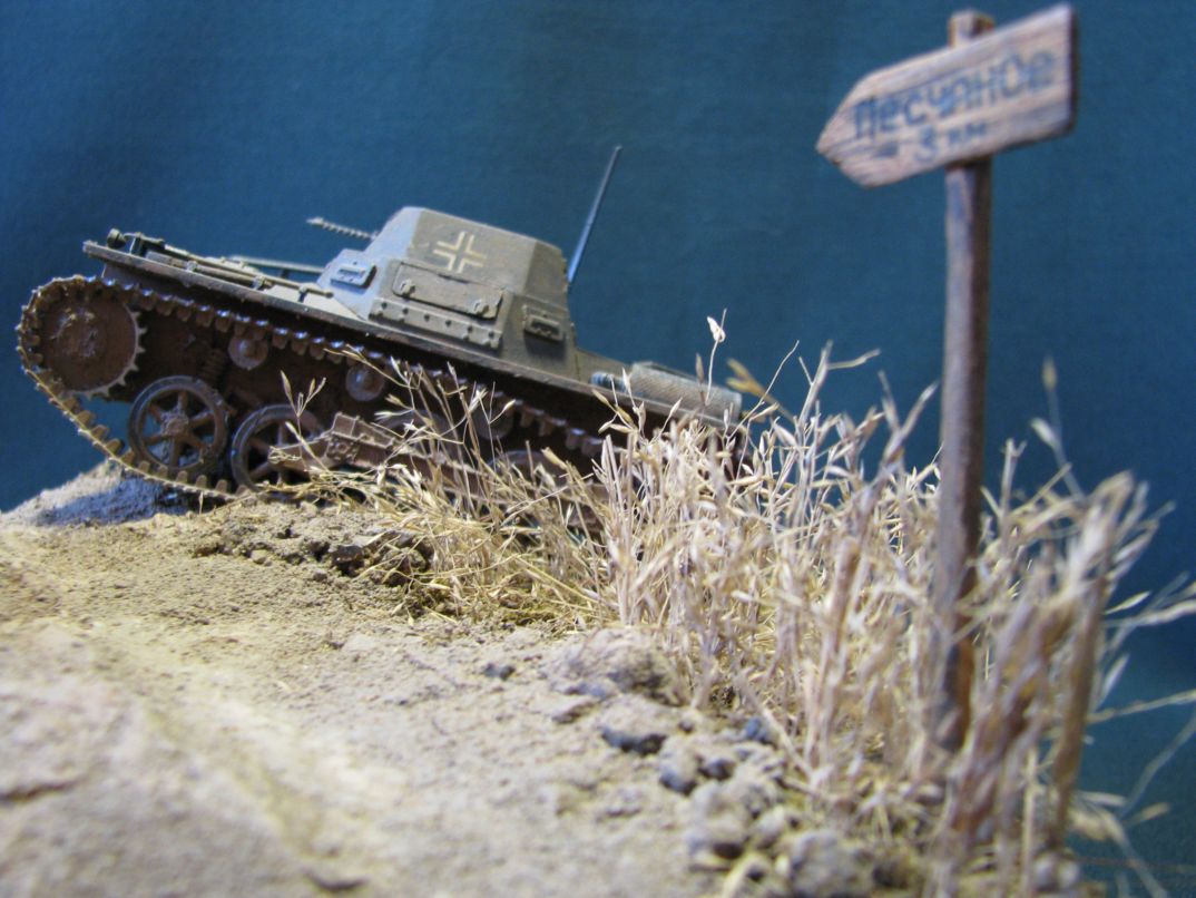 Максим Пешков, очень и очень здорово для первой работы. Искренне поздравляю. Небольшая критика, так сказать, ИМХО. Во-первых, всё же не хватает фигурок, это бы оживило диораму. Во-вторых, летом 41-го для немцев было важно хапнуть земли, поэтому танки, там где это было возможно, ехали по дорогам. Ну и в-третьих, номера наносились в панцерваффе по чётким регламентам, а не от руки.