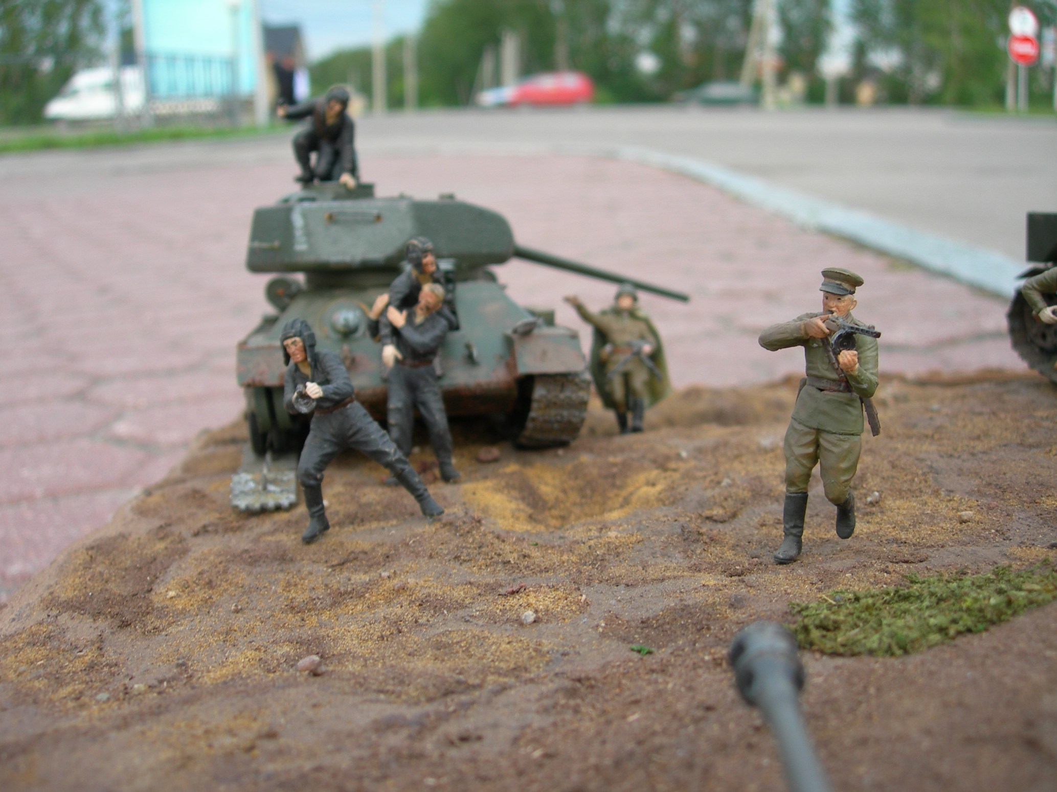 Andrey77, а вас не смущает, что танки, э-э-э, так сказать, по времени не подходят - очень-очень мала вероятность, что Т-34 с такой башней и Т-34/85 могли встретиться на одном пяточке фронта. Да, и кстати, фигурки советских бойцов тоже на несколько другой период, нежели Т-34/85.