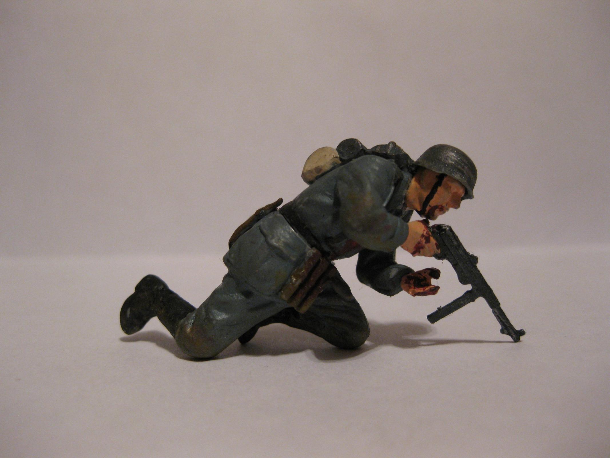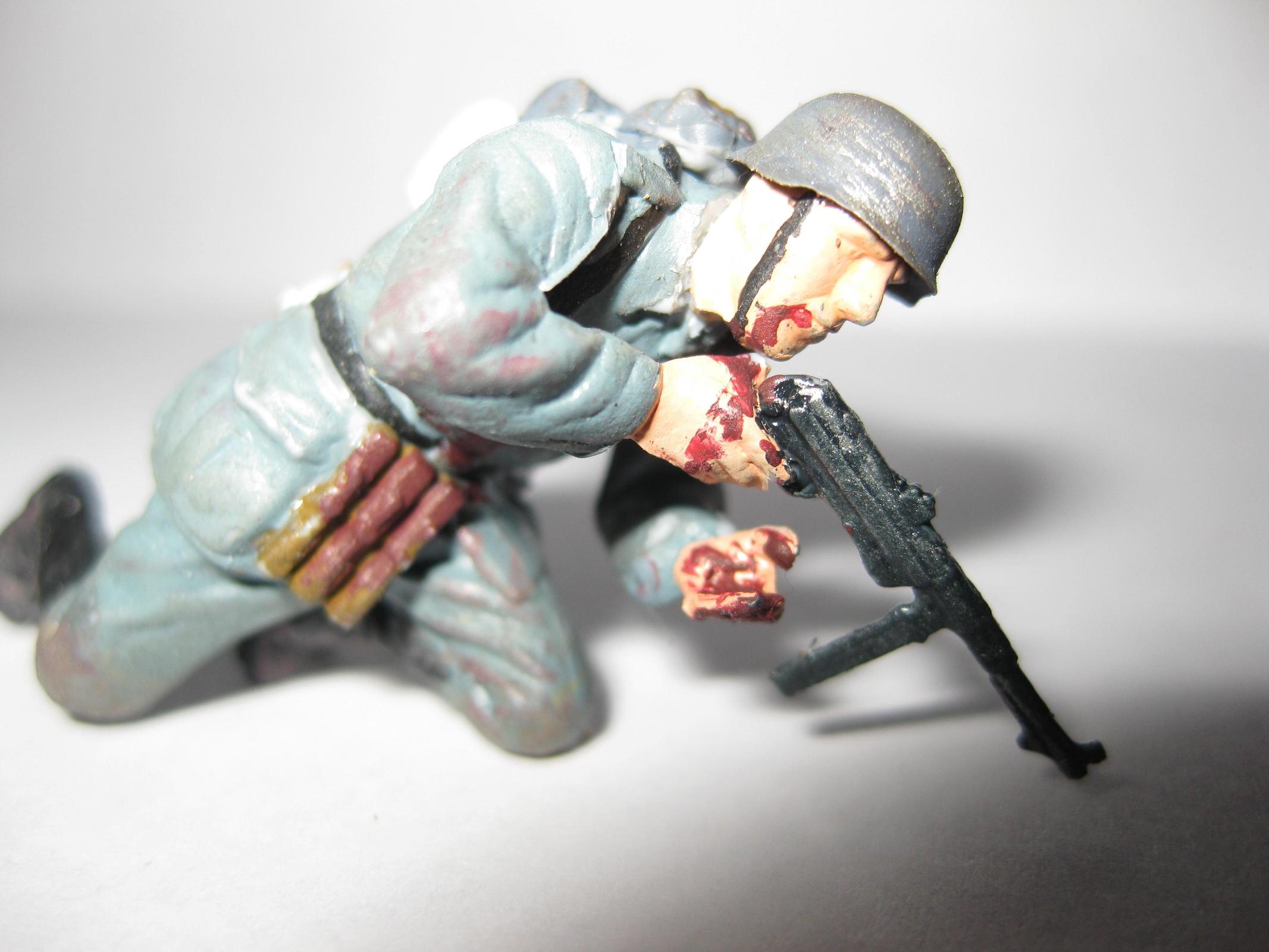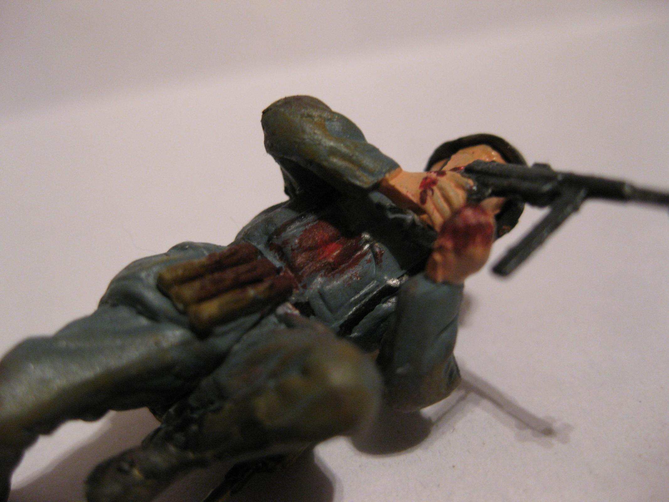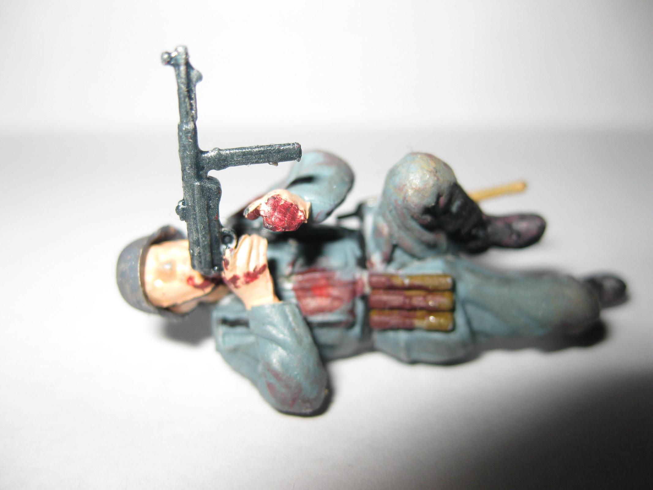 Интересная динамичная поза.Судя по всему получил штыком в пузо, так что пятна крови не на месте. Вообще лучше смойте краску и как следует доработайте фигурку: замажьте стыки, подшкурьте и перекрасьте, особенно лицо. Сам периодически балуюсь конверсизмом