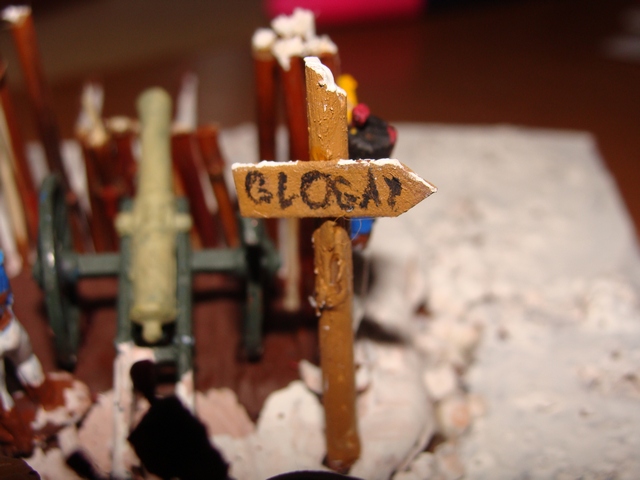 фигурки, пушки-"звезда", ландшафт-воск, краски: фигурки-"звезда", земля-гуашь. указатель-доска-картон, краски-"звезда". колья- веточки, концы которых, заточены на точилке.