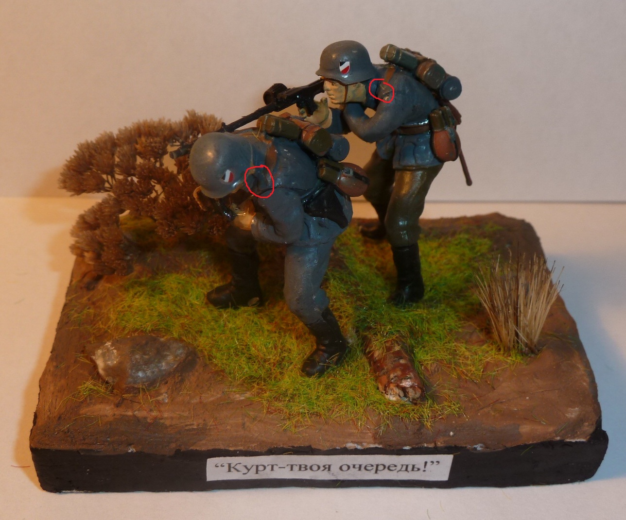 Мда."Учите матчасть!"Косяков море.Щитки на касках не с той стороны,"кекс" у MG-34 так же с обратной стороны и не черный,ручка бакелитовая и ремень надо сделать,фляги на поясной ремень не повесить(они цеплялись карабином за полукольца).Стыки прессформ зачищать требуется.Разбитой каски не увидел как и рамки из реек.Про остальное сказали.